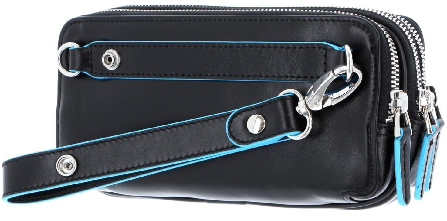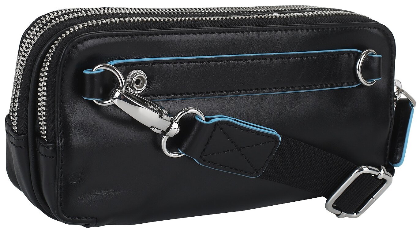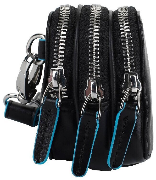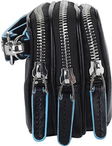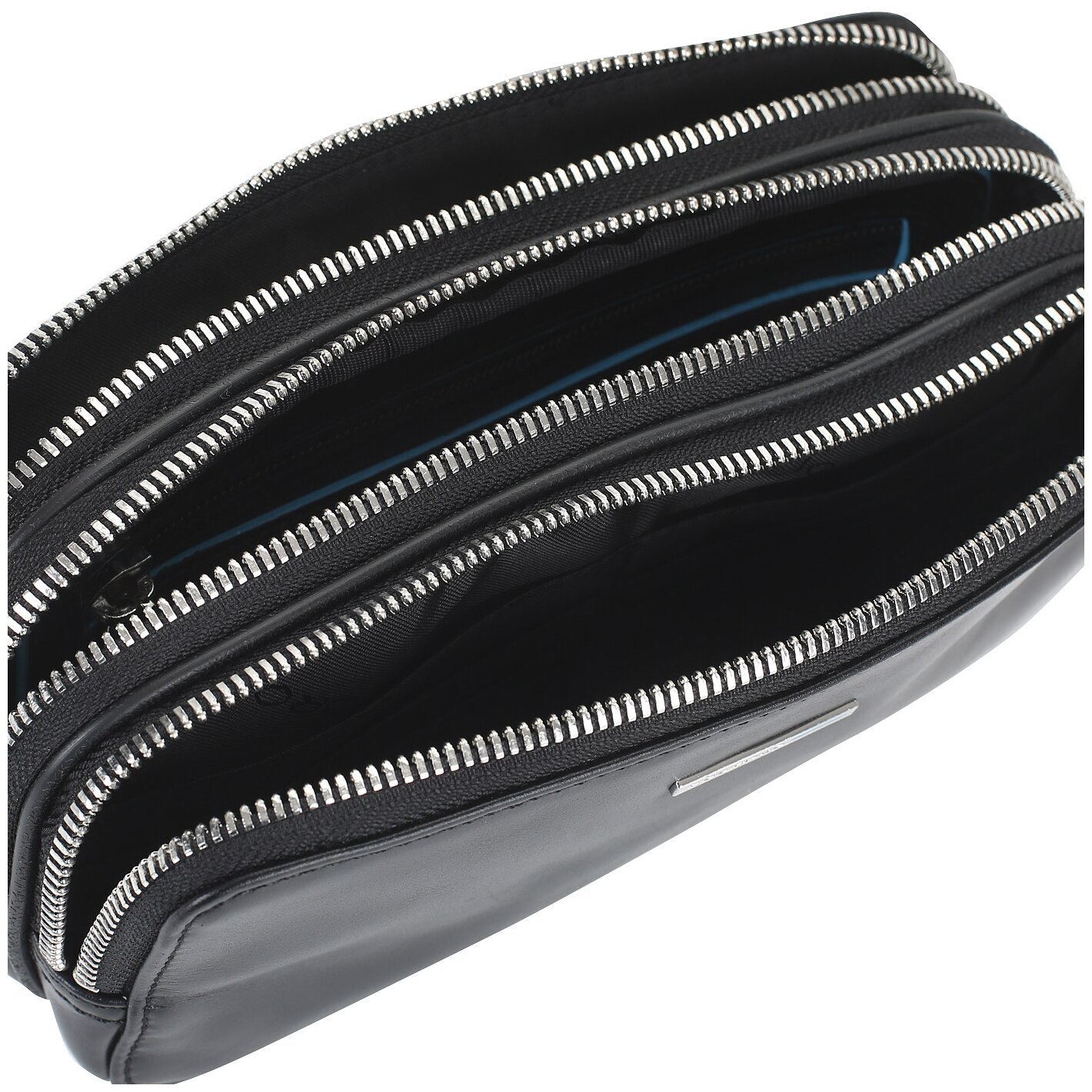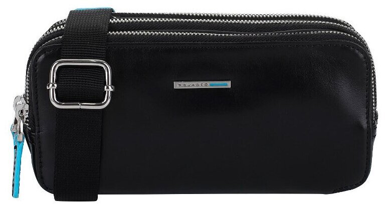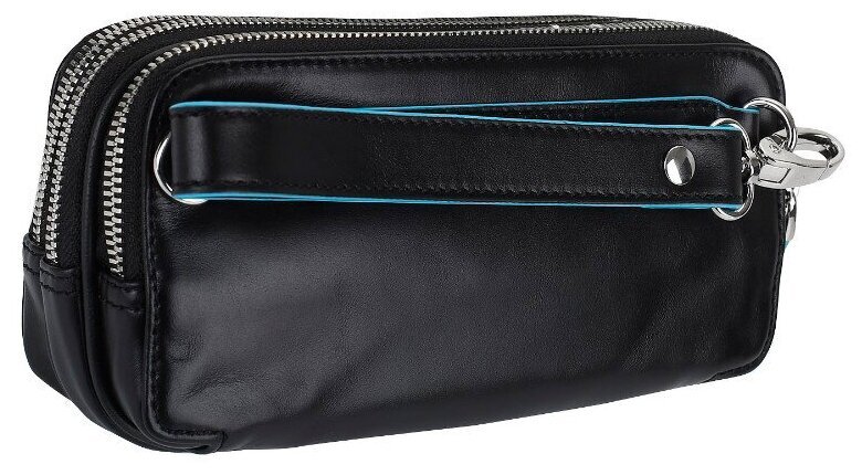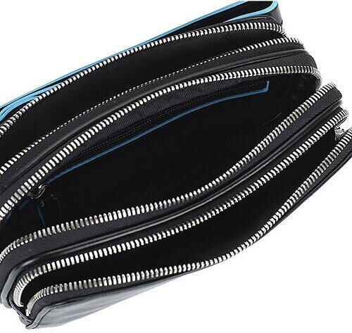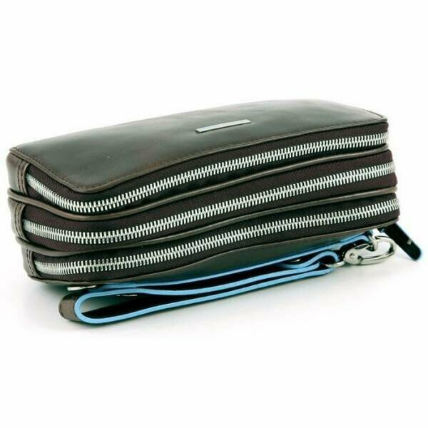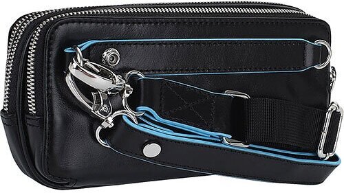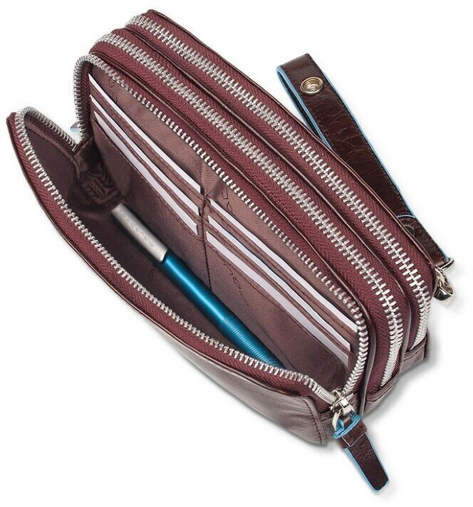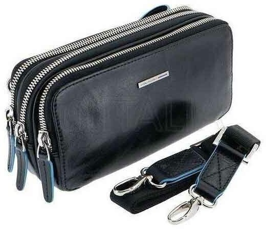 Кожаная барсетка из самой популярной коллекции Piquadro Blue Square. Изготовлена из гладкой телячьей, полуанилиновой кожи с фирменным голубым кантом. Барсетка имеет 3 отделения на молнии, в двух из них по 6 кармашков для банковских карт, в центральном отделении есть внутренний карман на молнии. В барсетку с легкостью помещается паспорт, водительское удостоверение, телефон и ключи. На задней стороне барсетки располагается крепление для ремешка на запястье и плечевого ремня. Выпускается в темно-синем, черном и коричневом цвете.