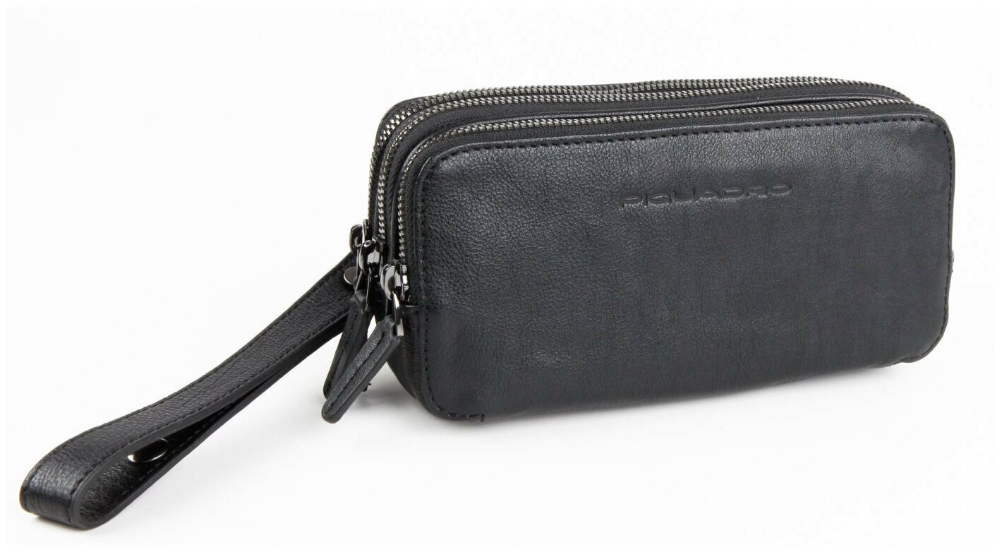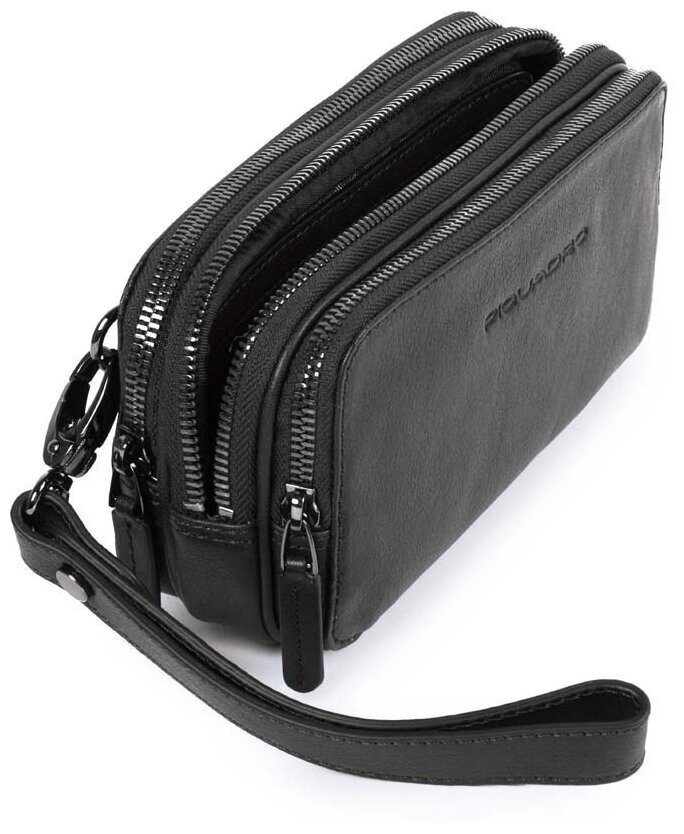 Клатч из коллекции Piquadro Black Square. Изготовлена из высококачественной структурной телячьей кожи с черным кантом. Имеет три отделения с кармашками для 12 банковских карт, съемный плечевой ремень и хлястик на запястье. Очень полезный аксессуар на каждый день