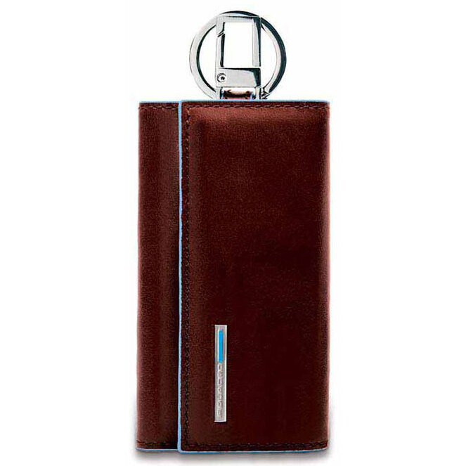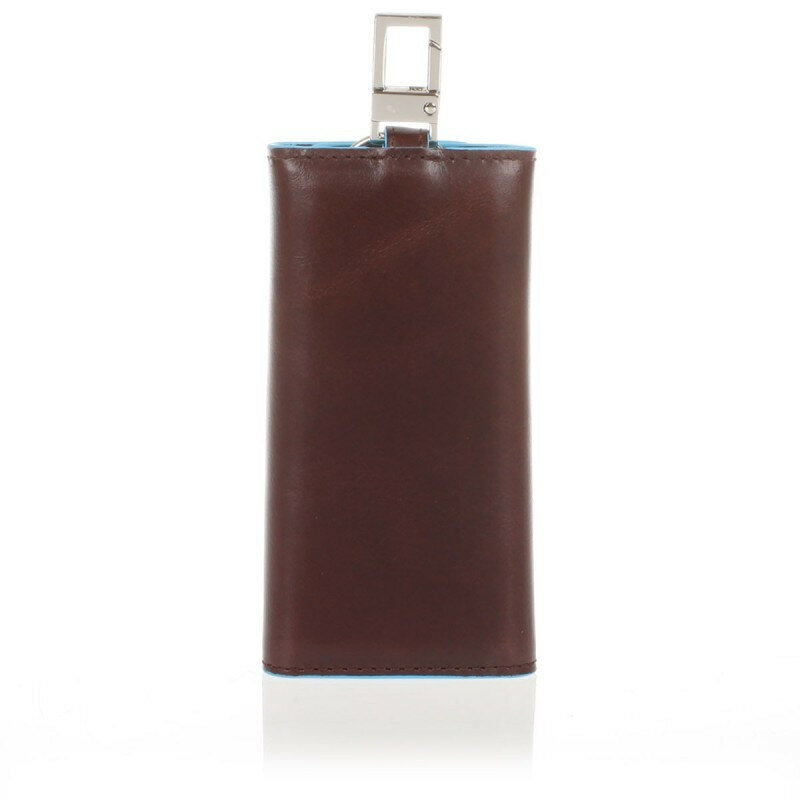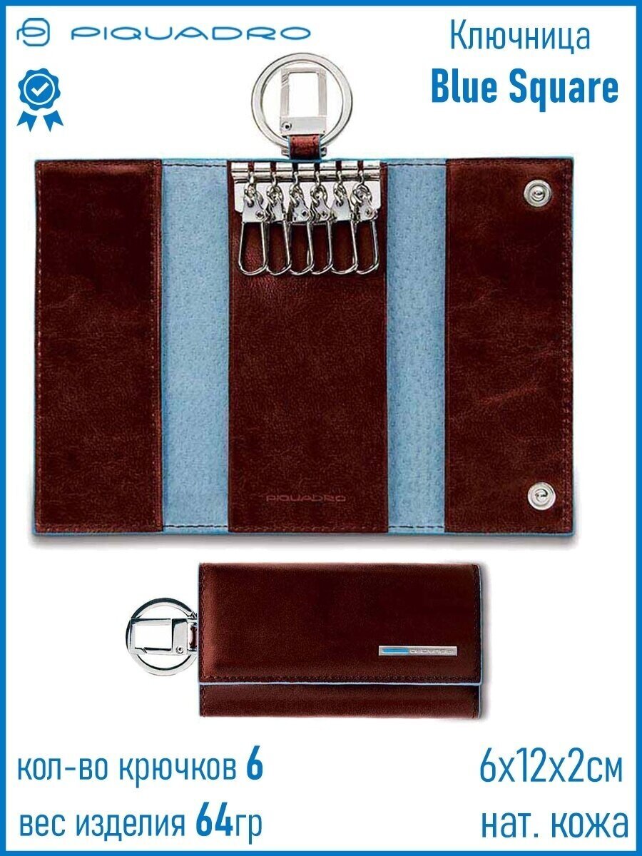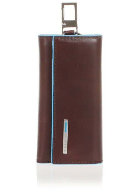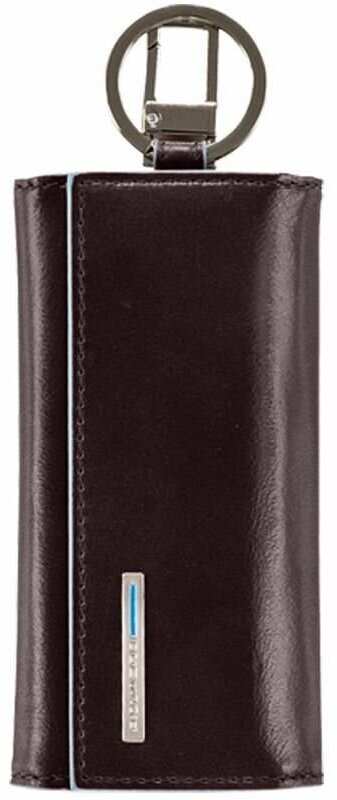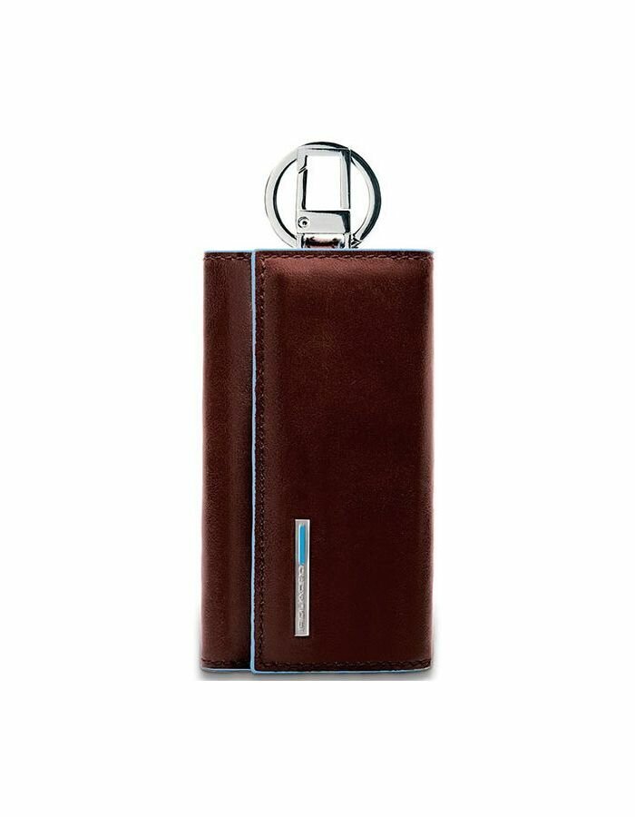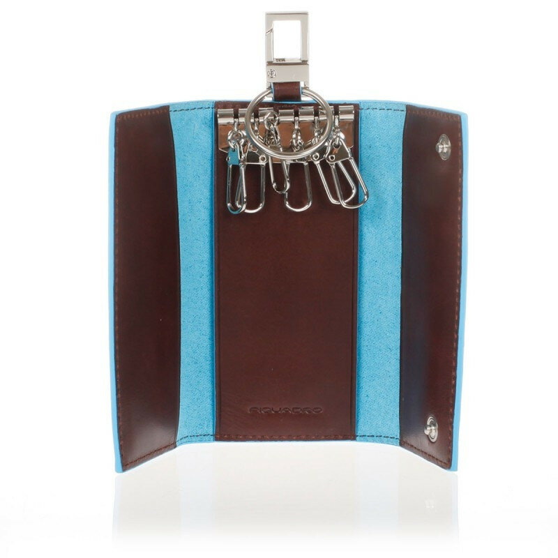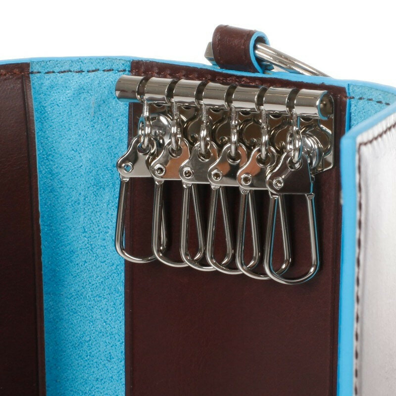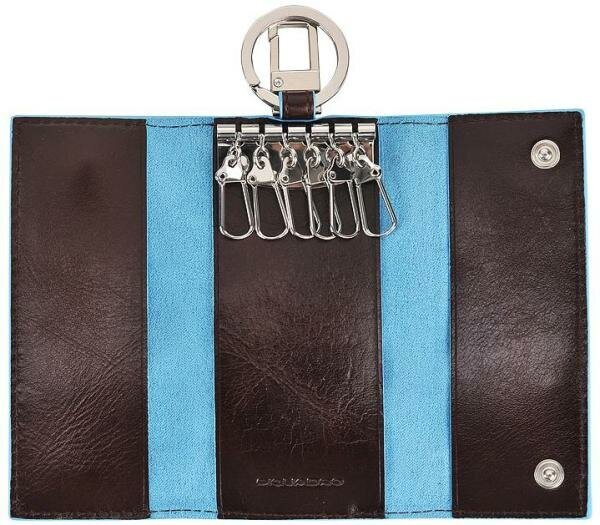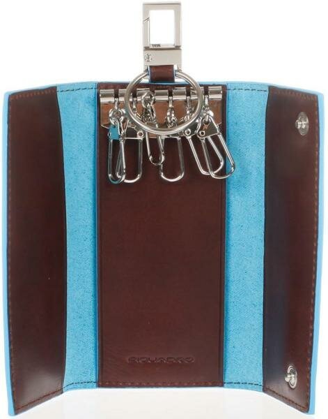 Ключница на 6 ключей, натуральная кожа. Оторочка по канту - голубым. Внешнее кольцо и карабин - для крепления к поясу, шнурку, дополнительных крупных ключей или др. Фирменная упаковка.