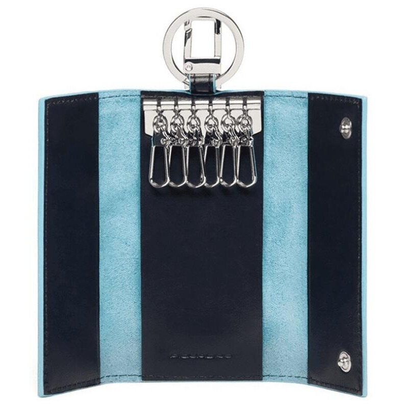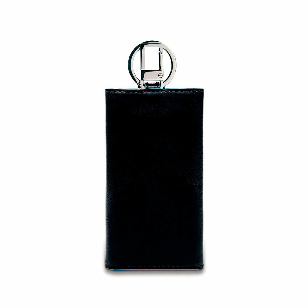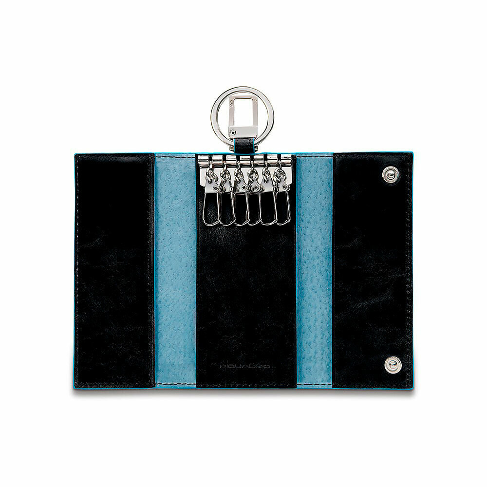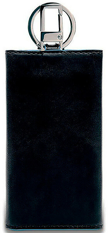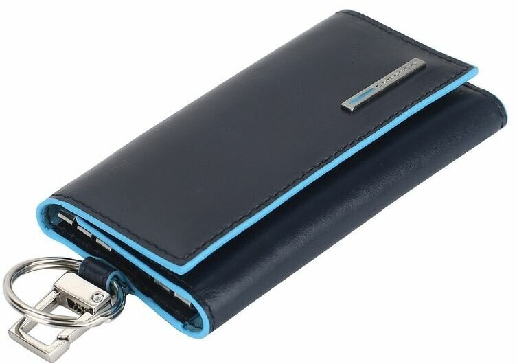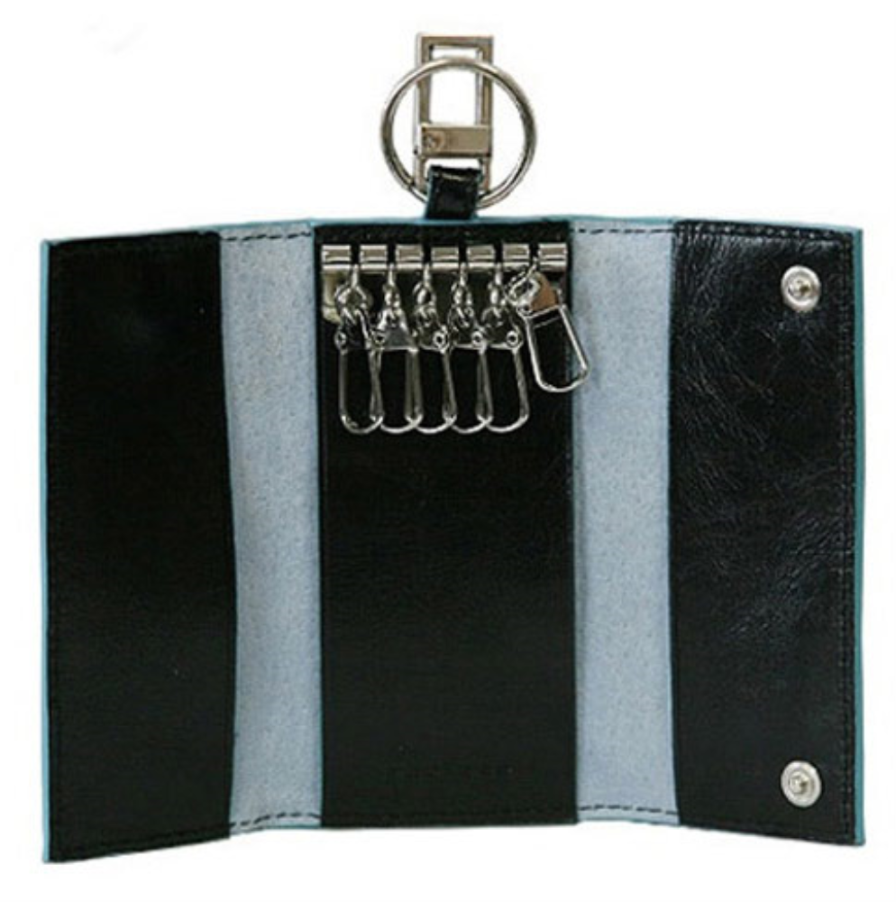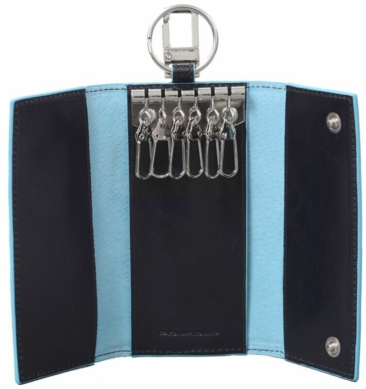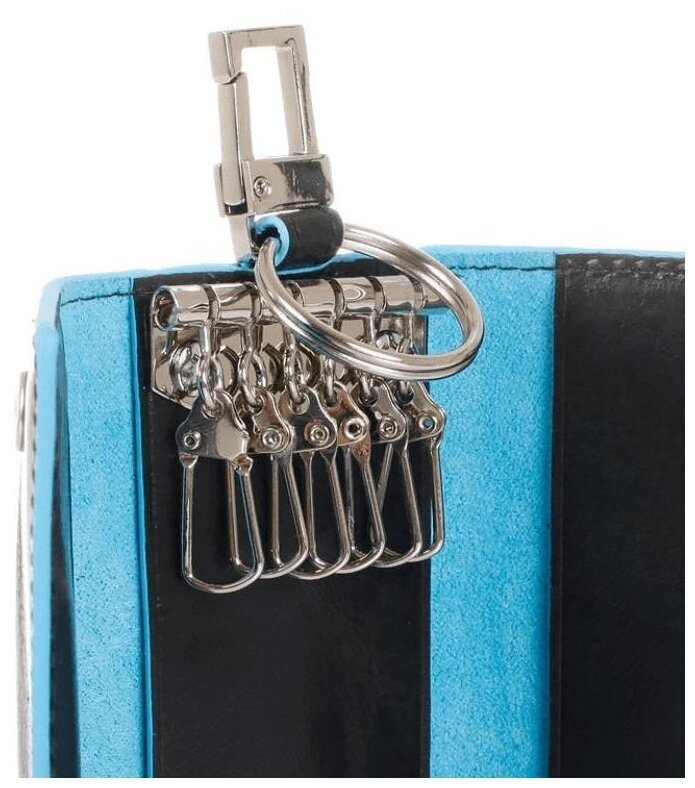 Ключница на 6 ключей, натуральная кожа. Оторочка по канту - голубым. Внешнее кольцо и карабин - для крепления к поясу, шнурку, дополнительных крупных ключей или др. Фирменная упаковка.