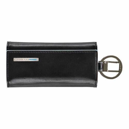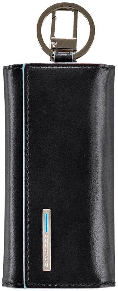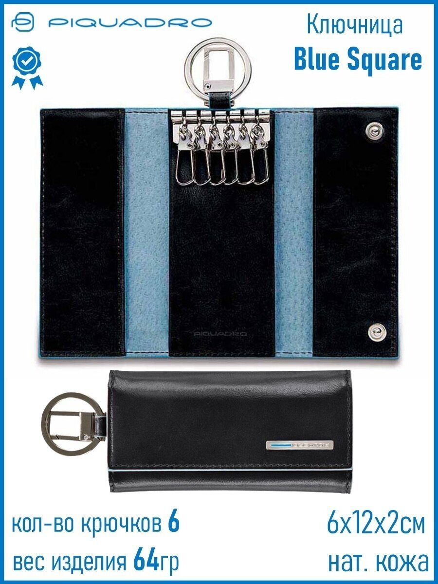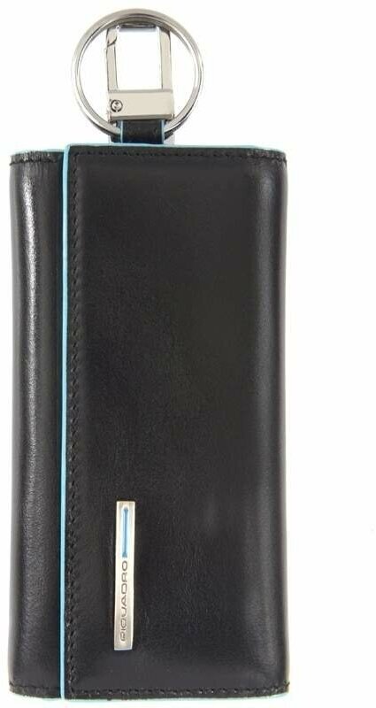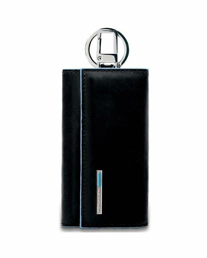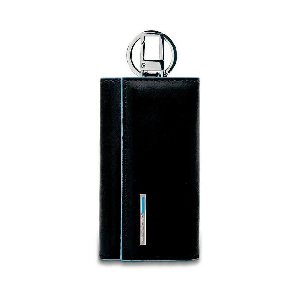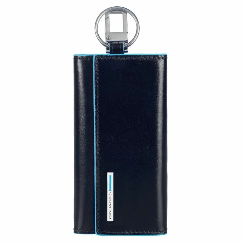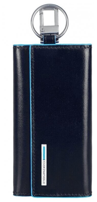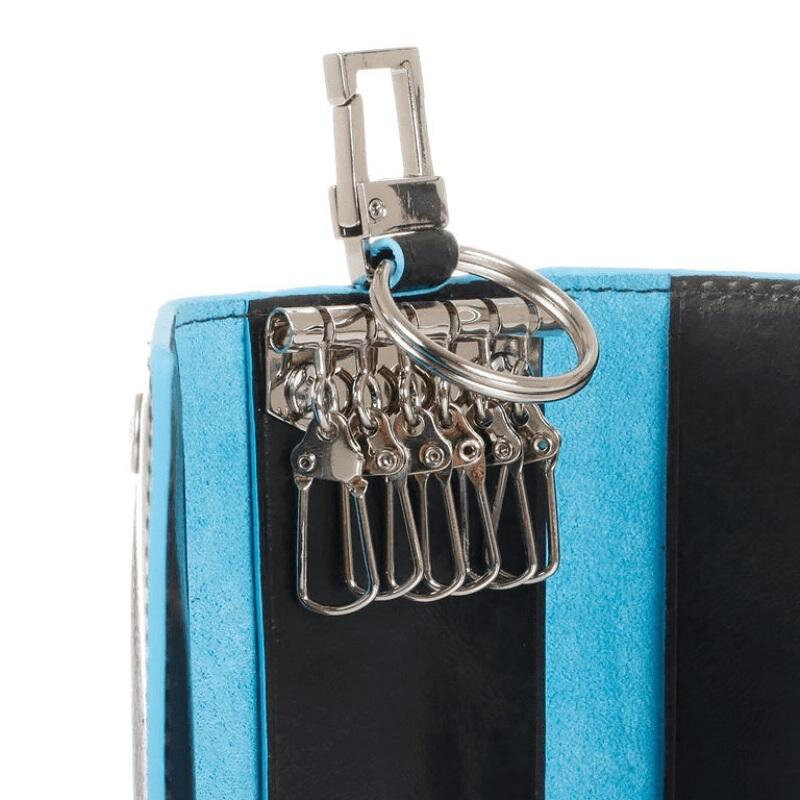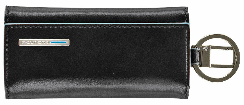 Ключница на 6 ключей, натуральная кожа. Оторочка по канту - голубым. Внешнее кольцо и карабин - для крепления к поясу, шнурку, дополнительных крупных ключей или др. Фирменная упаковка.
