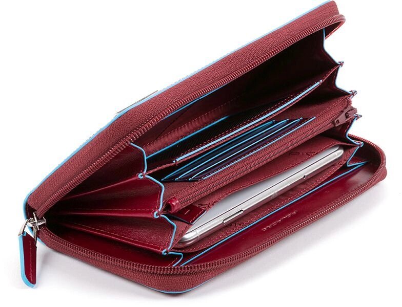 Женское портмоне из коллекции Piquadro Blue Square. Изготовлено из мягкой телячьей кожи с восковой пропиткой и фирменным голубым кантом. Имеет один карман на молнии и отделения для 12 банковский карт с RFID защитой, которая не позволит списать деньги с карты бесконтактным способом.