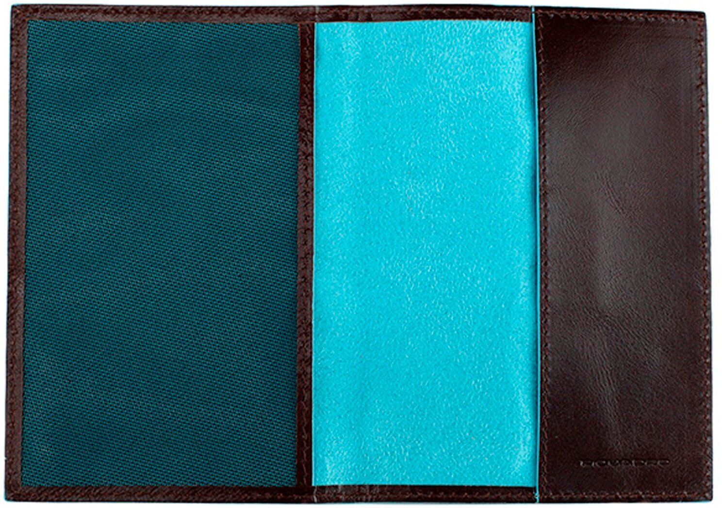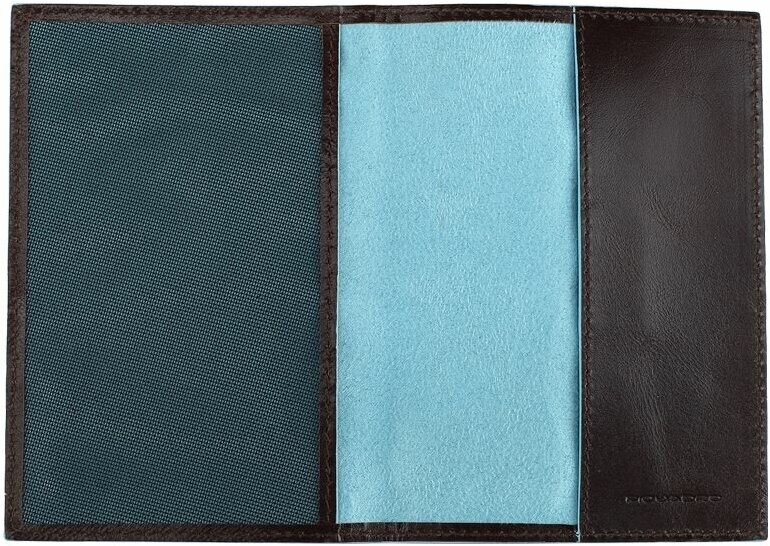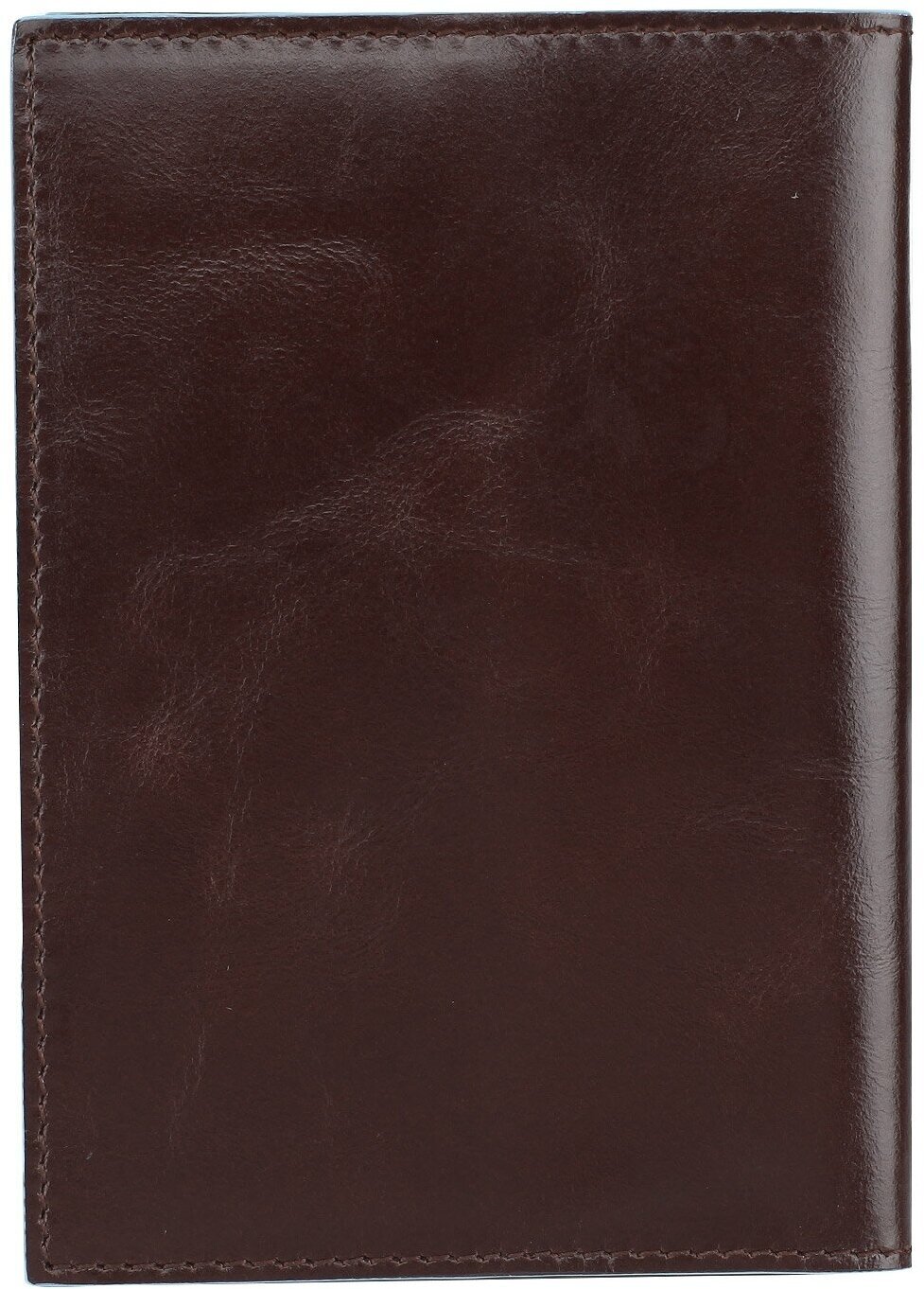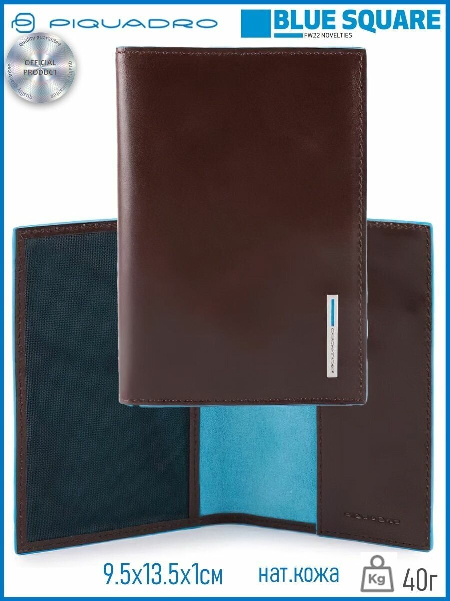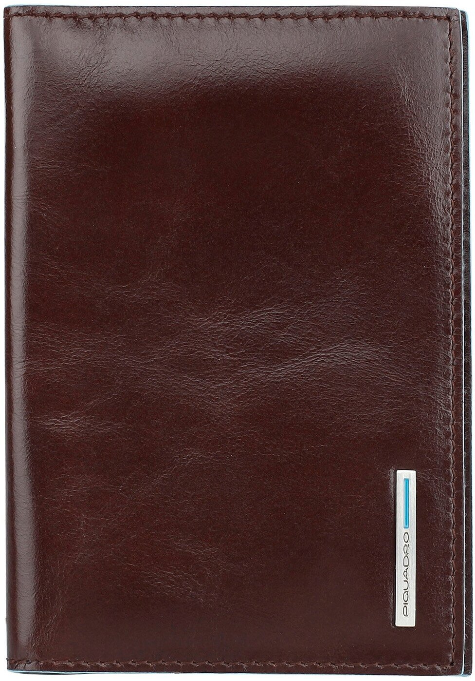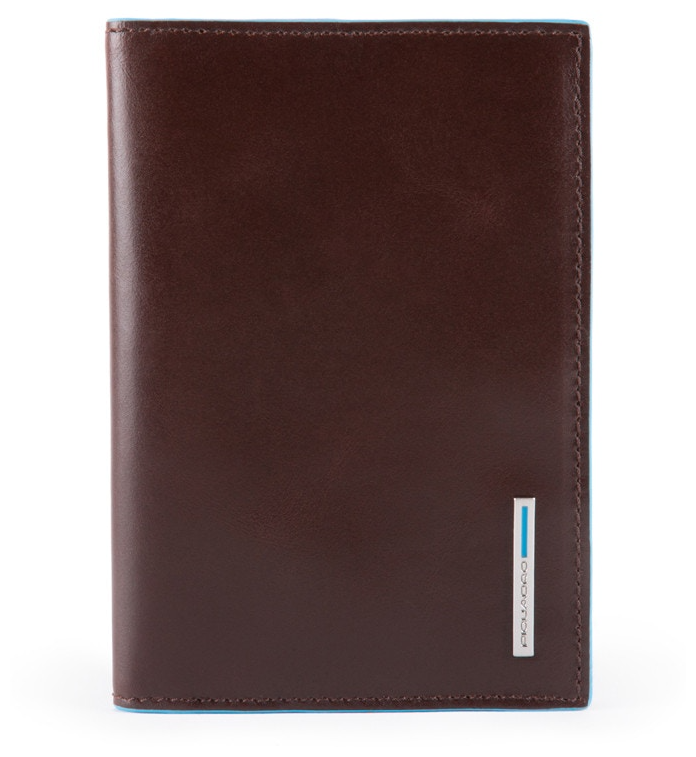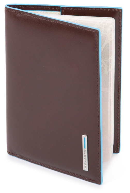 Стильная обложка для паспорта из гладкой телячьей кожи с голубой окантовкой из коллекции Piquadro Blue Square. Упакована в фирменную коробку.