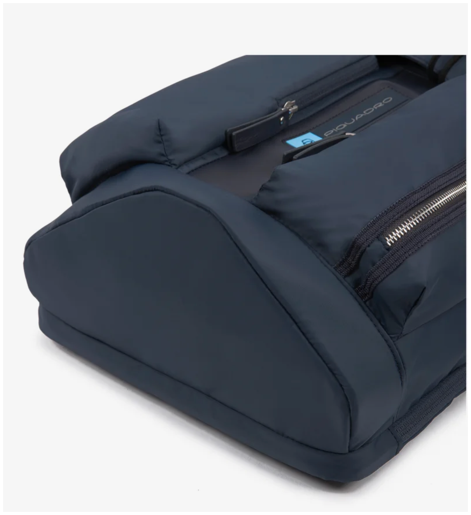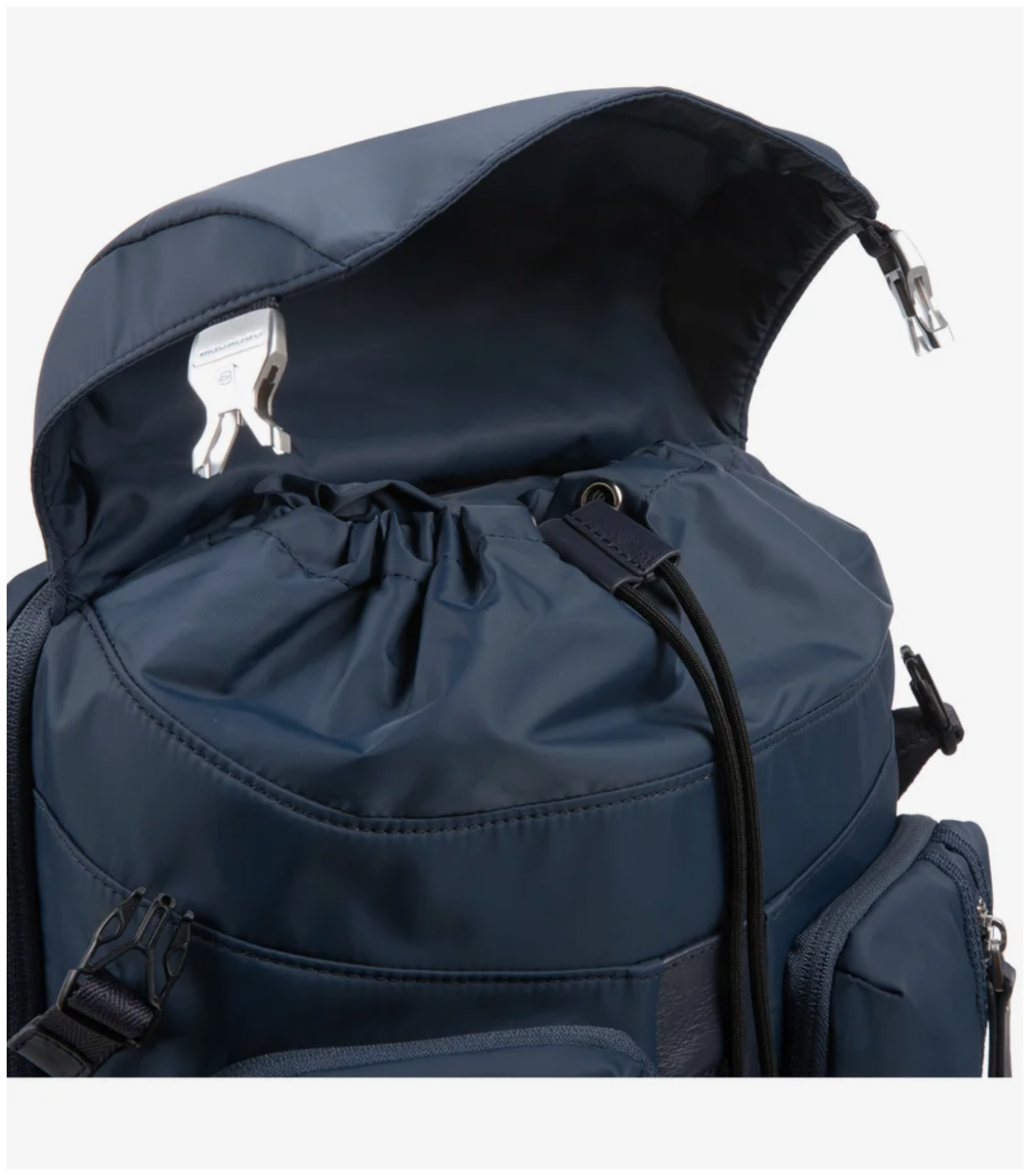 Городской стильный рюкзак из коллекции Piquadro Bios. Изготовлен из переработанного нейлона с кожаными вставками. Рюкзак имеет одно большое отделение на шнуровке, карман на молнии с отсеком для 15.6 дюймового ноутбука и два вертикальных кармана на молнии на передней части. Вес: 700 гр. Объем: 19 л.