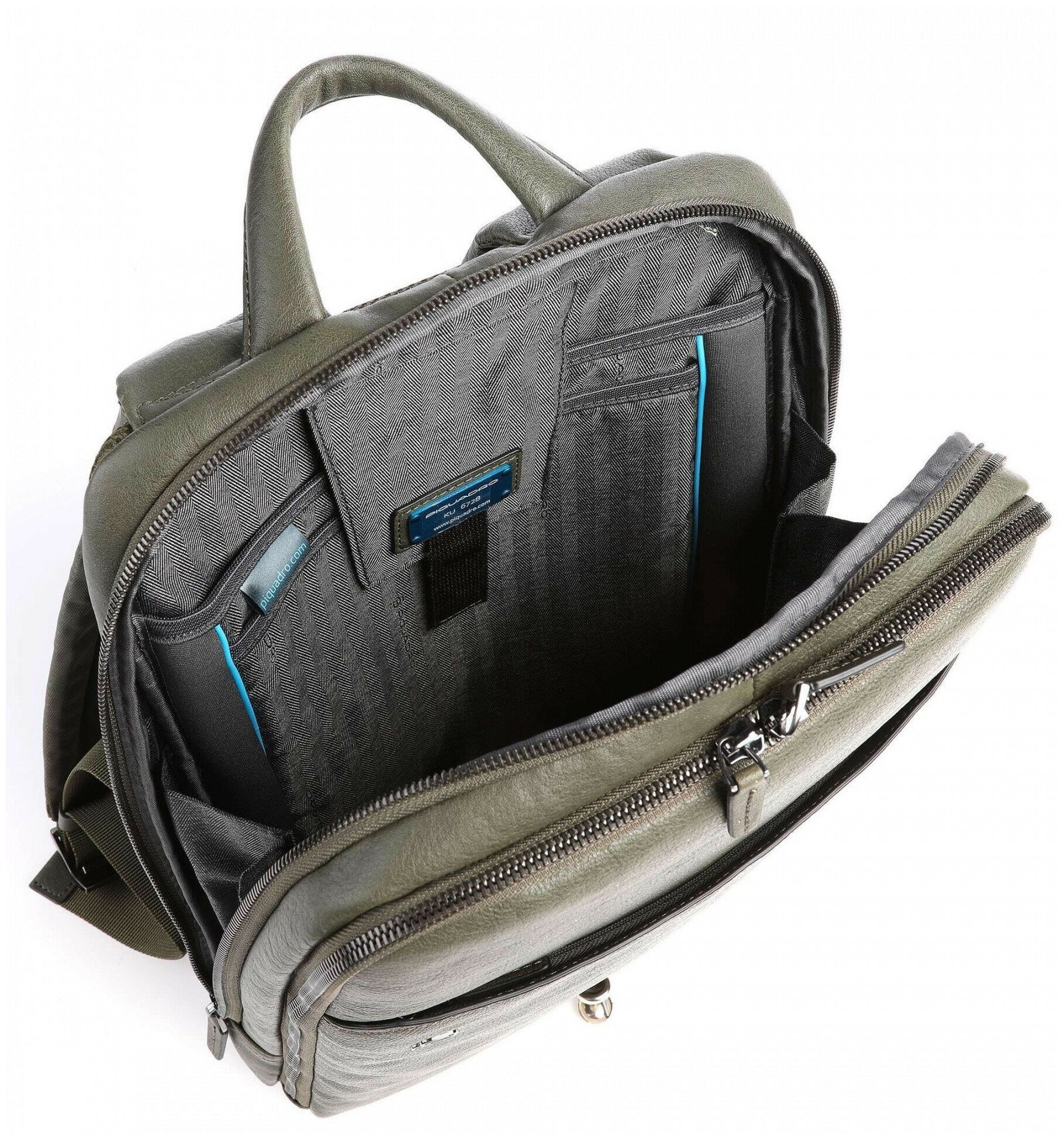 Кожаный бизнес-рюкзак с двумя отделениями из коллекции Piquadro Black Square. Изготовлен из высококачественной мелкозернистой телячьей кожи. Имеет отсеки для 14 дюймового ноутбука и планшета, карманы для письменных принадлежностей и телефона, внутренний карман на молнии. На задней части рюкзака расположен скрытый карман для портмоне с RFID защитой и планка для крепления на дорожную сумку.
