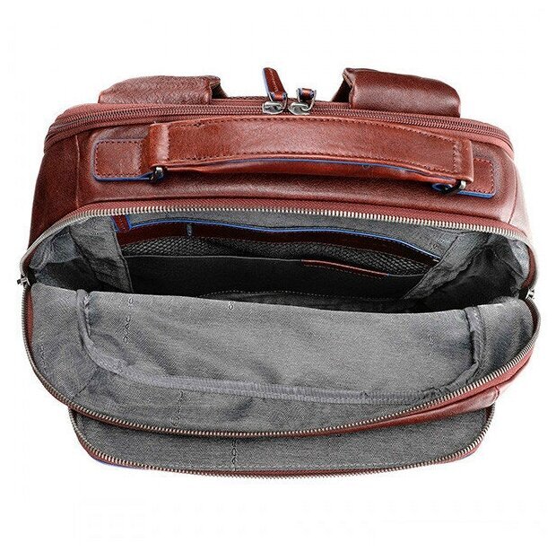 Кожаный рюкзак для документов и ноутбука из новой коллекции Piquadro Blue Square. Рюкзак изготовлен из телячьей текстурной матовой кожи натурального дубления. В рюкзаке есть одно отделение на молнии, с отсеками для Ipad 10,5 дюймов и 15.6 дюймового ноутбука, а также второе, большое и вместительное отделение. Во внешнем кармане на молнии расположено место для ручек и отсек для телефона. На боковой части карман для зонта. Хороший вариант вместительного кожаного рюкзака, прекрасно подойдет для работы и небольших командировок.