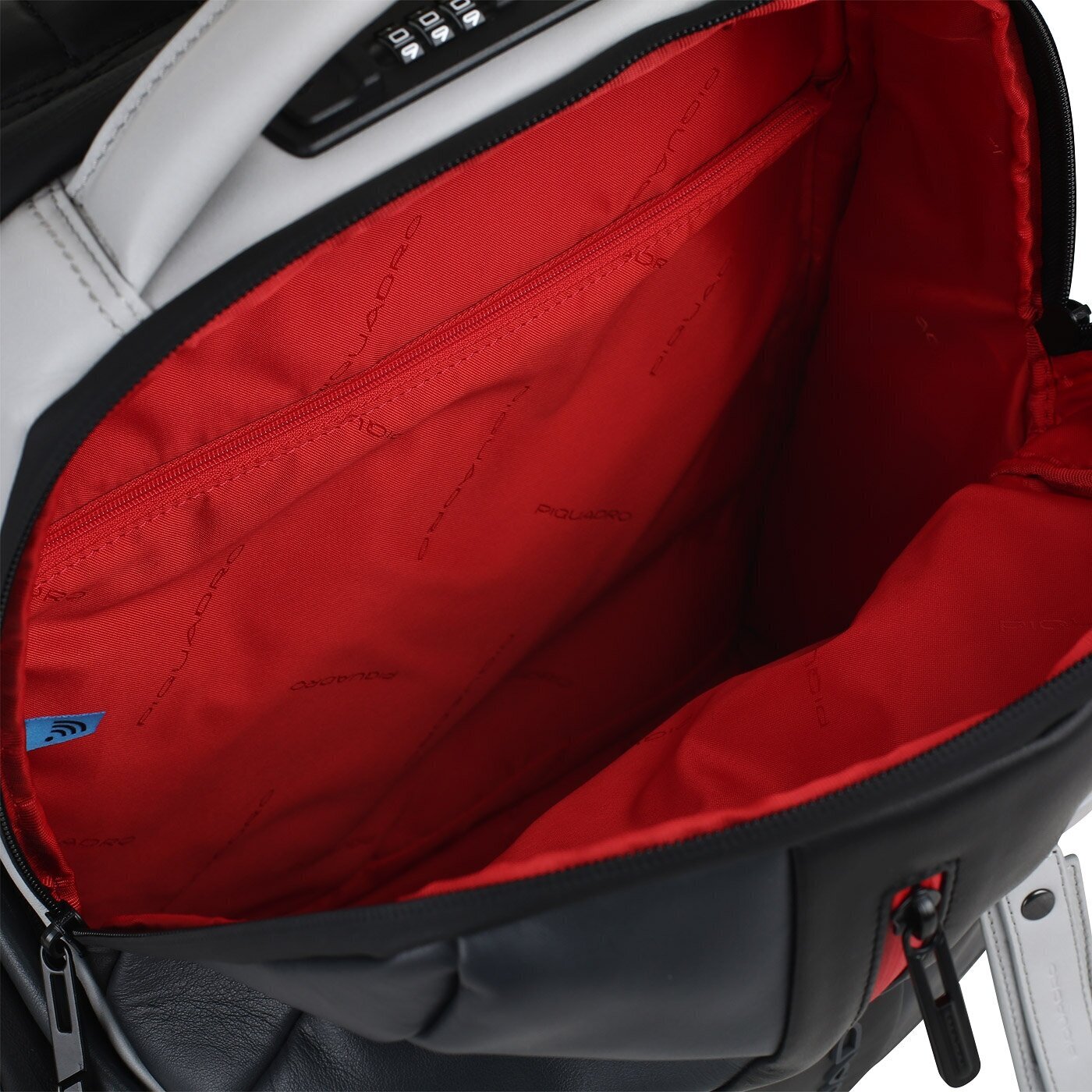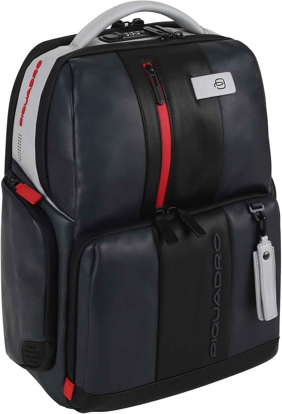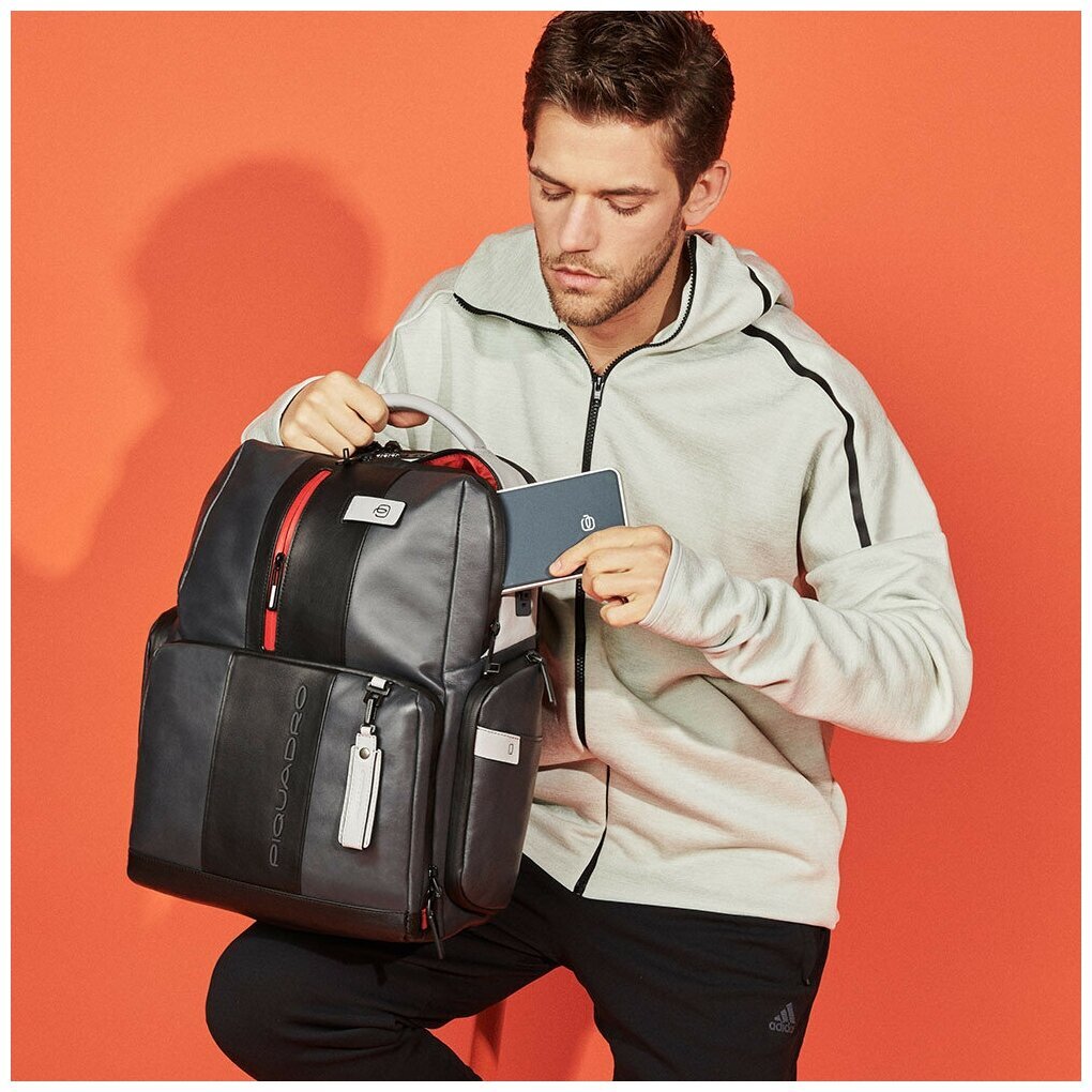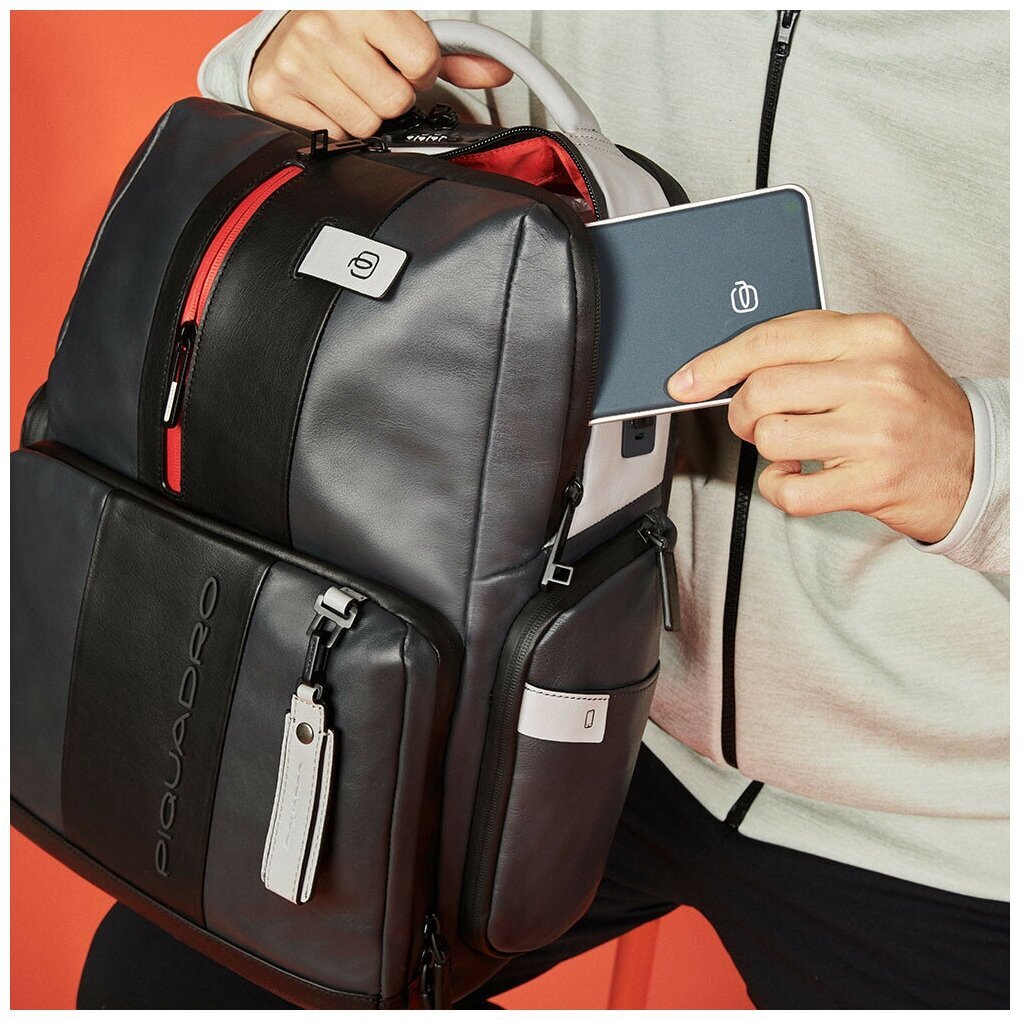 Датчик CONNEQU отсутствует! Кожаный бизнес-рюкзак из новой коллекции Piquadro Urban. Рюкзак изготовлен из мягкой телячьей кожи с использованием черненой металлической фурнитуры. Это флагманская модель рюкзака, здесь реализованы такие "фишки", как: кодовый замок на одном из отделений, RFID защита, позволяющая избежать снятия денежных средств бесконтактным способом, "антиворовской" шнур, с помощью которого можно пристегнуть рюкзак и не беспокоится, что его своруют, USB выходы для зарядки Ваших гаджетов, а также крепеж на чемодан, крючок для очков и брелок с контактной информацией. Рюкзак имеет два отделения в одном из которых расположен отсек для 15,6 дюймового ноутбука и планшета, а боковые карманы предназначены для небольшой бутылки и зонтика. Идеальный вариант, как для работы на каждый день, так и для поездок.