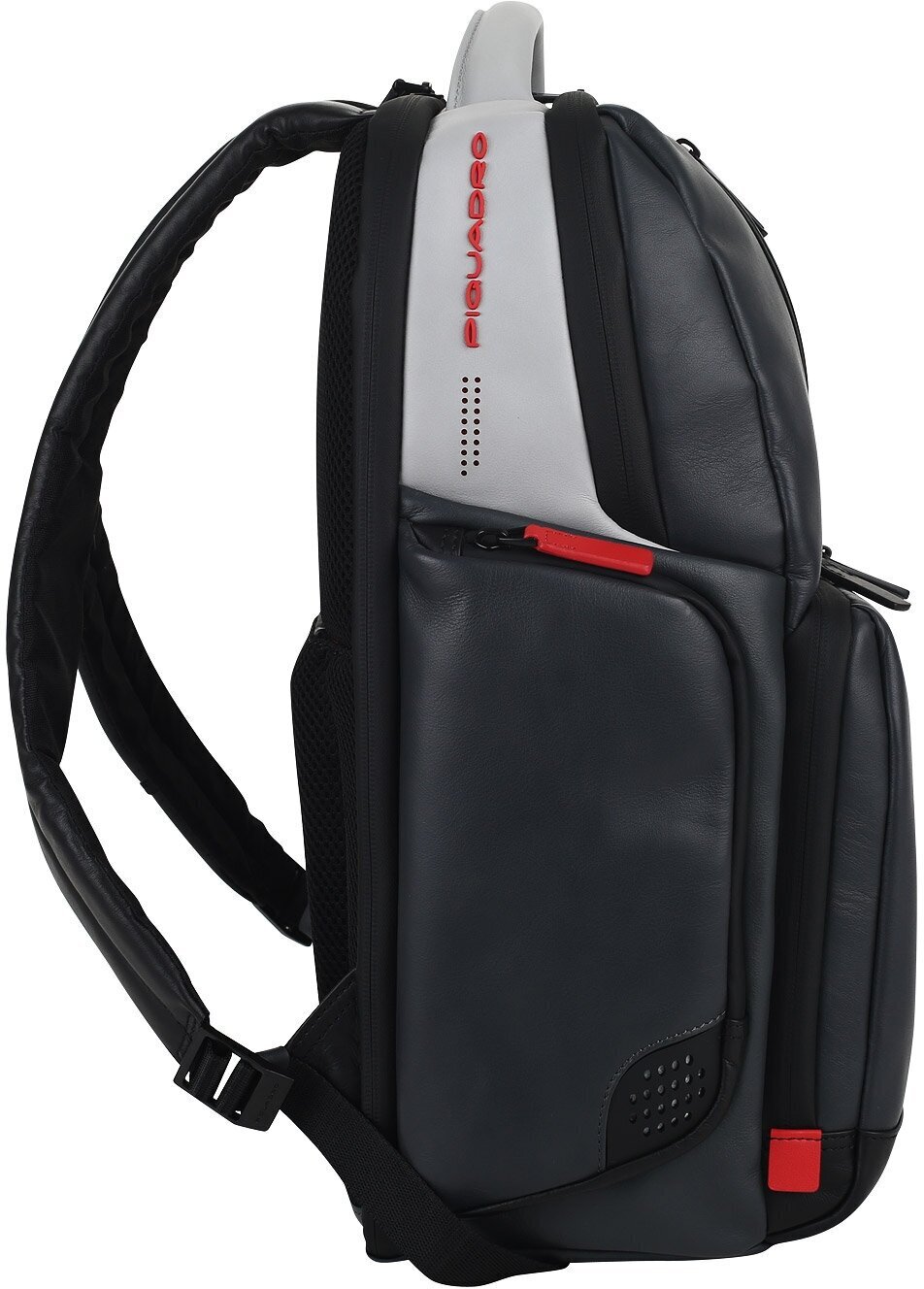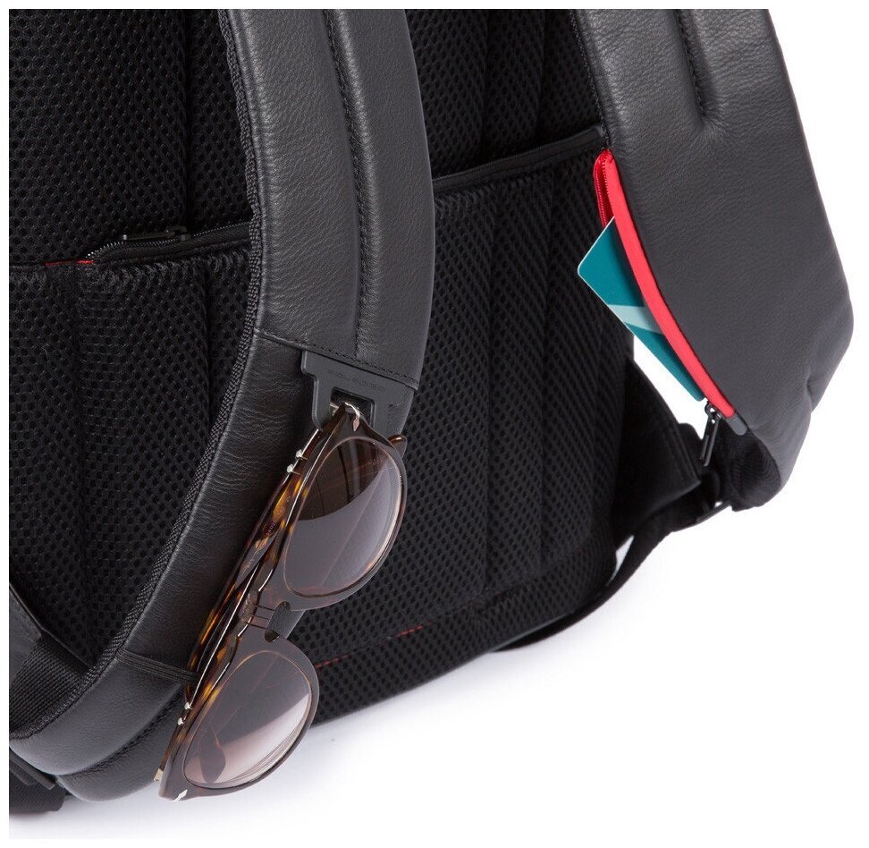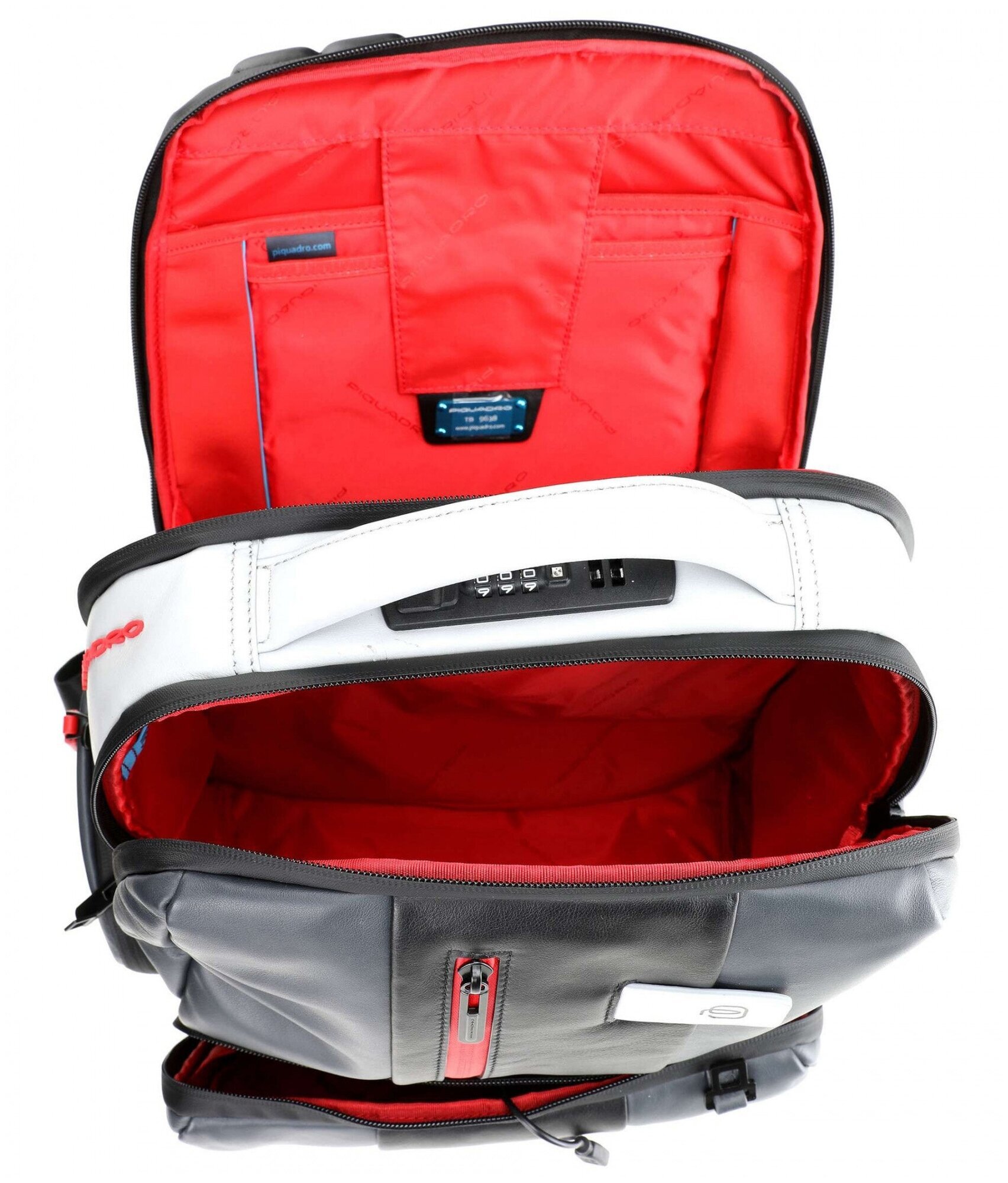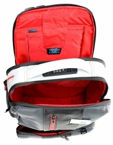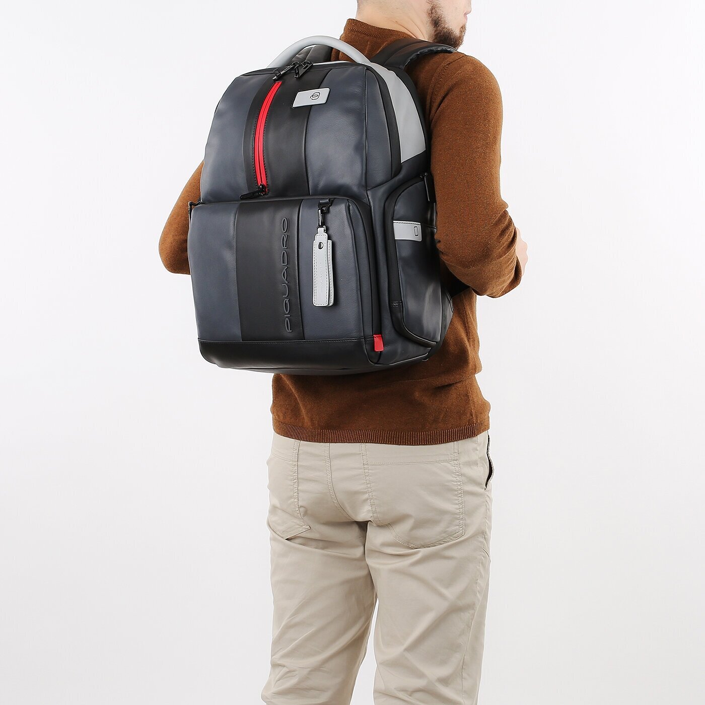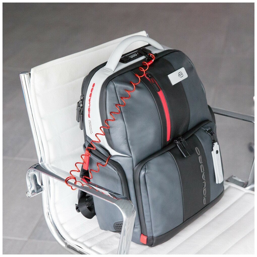 Датчик CONNEQU отсутствует! Кожаный бизнес-рюкзак из новой коллекции Piquadro Urban. Рюкзак изготовлен из мягкой телячьей кожи с использованием черненой металлической фурнитуры. Это флагманская модель рюкзака, здесь реализованы такие "фишки", как: кодовый замок на одном из отделений, RFID защита, позволяющая избежать снятия денежных средств бесконтактным способом, "антиворовской" шнур, с помощью которого можно пристегнуть рюкзак и не беспокоится, что его своруют, USB выходы для зарядки Ваших гаджетов, а также крепеж на чемодан, крючок для очков и брелок с контактной информацией. Рюкзак имеет два отделения в одном из которых расположен отсек для 15,6 дюймового ноутбука и планшета, а боковые карманы предназначены для небольшой бутылки и зонтика. Идеальный вариант, как для работы на каждый день, так и для поездок.