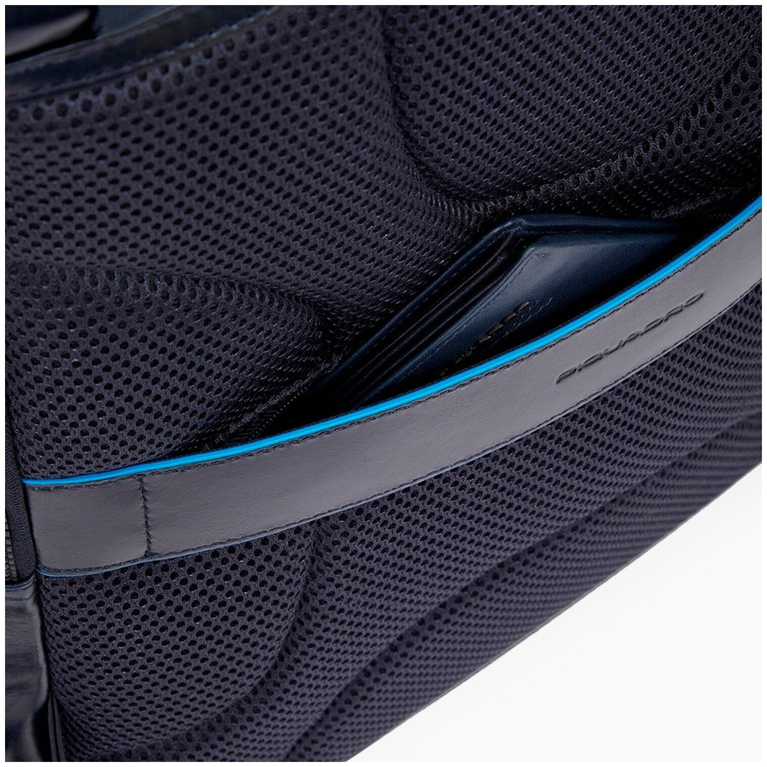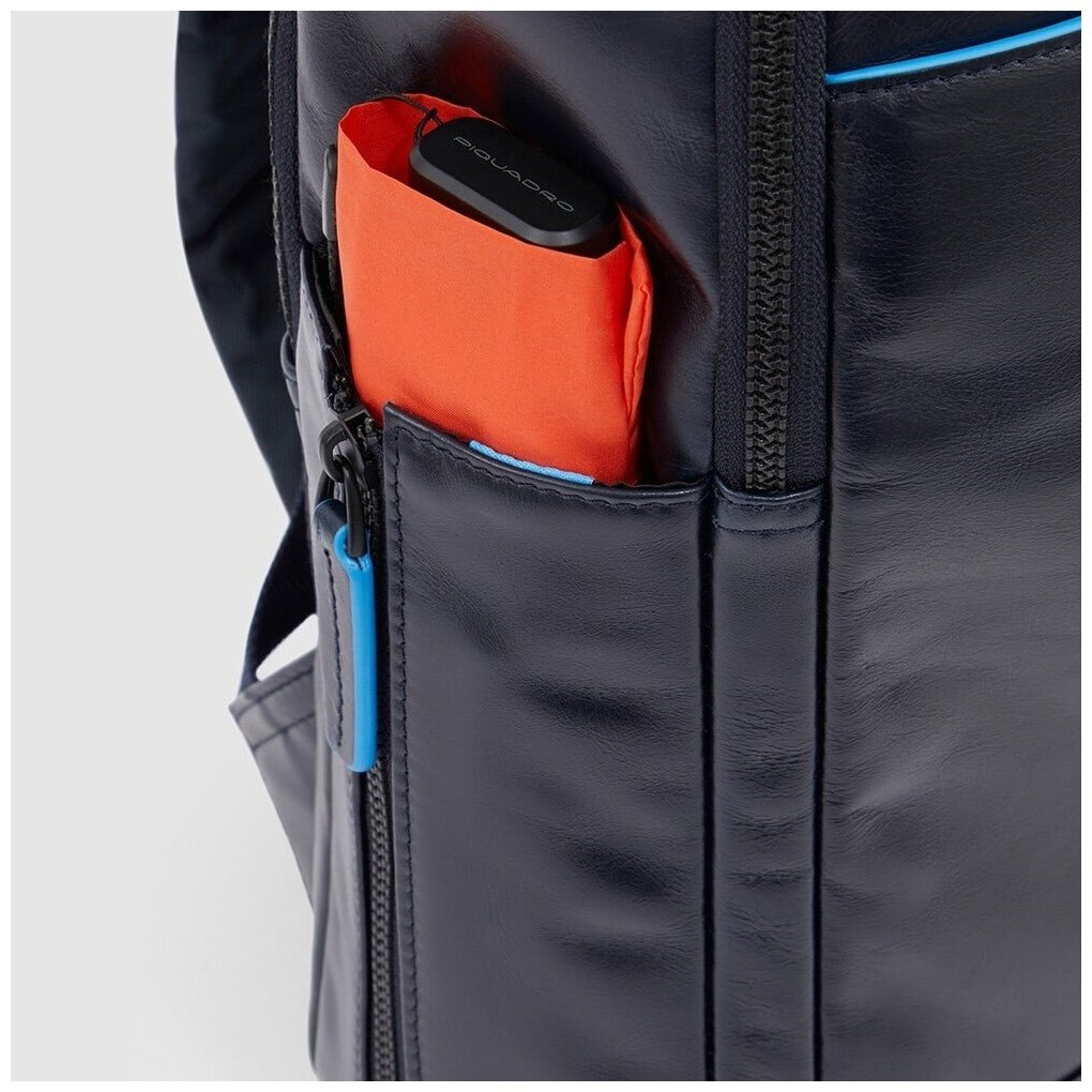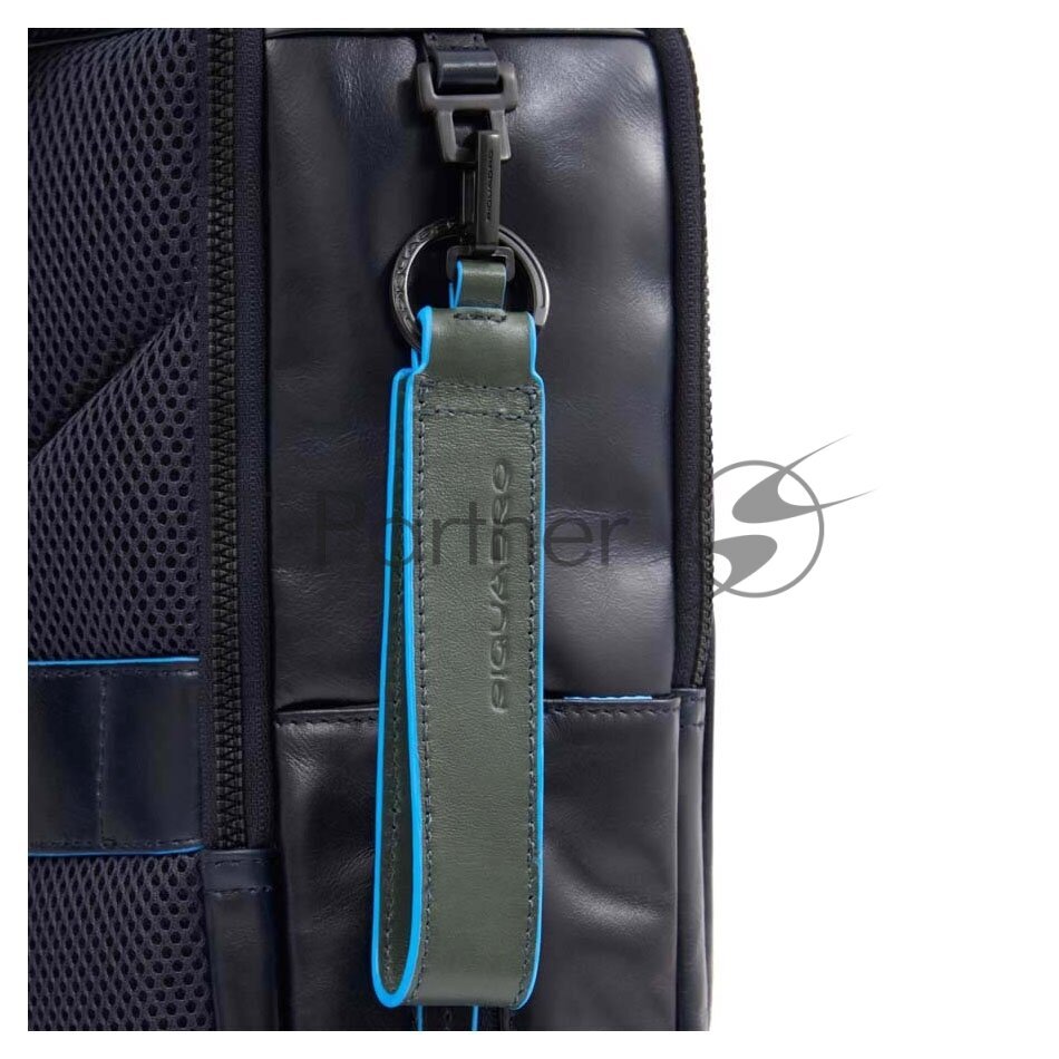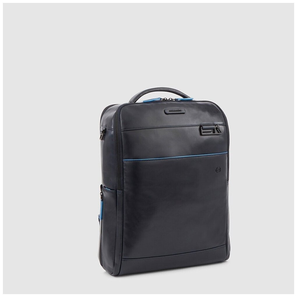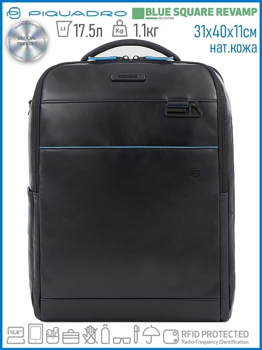 Стильный мужской рюкзак из гладкой натуральной телячьей кожи с голубым кантом и черной фурнитурой. Коллекция Blue Square Revamp (B2V). Имеет два отделения с отсеком для 15,6" ноутбука и планшета. Сбоку карман для бутылки/зонта, на задней стенке скрытый карман на молнии и крепление на дорожный чемодан. Универсальная модель рюкзака для ноутбука и документов, не громоздкая, отлично подходит для ежедневного использования. Новинка 2023 модельного года.