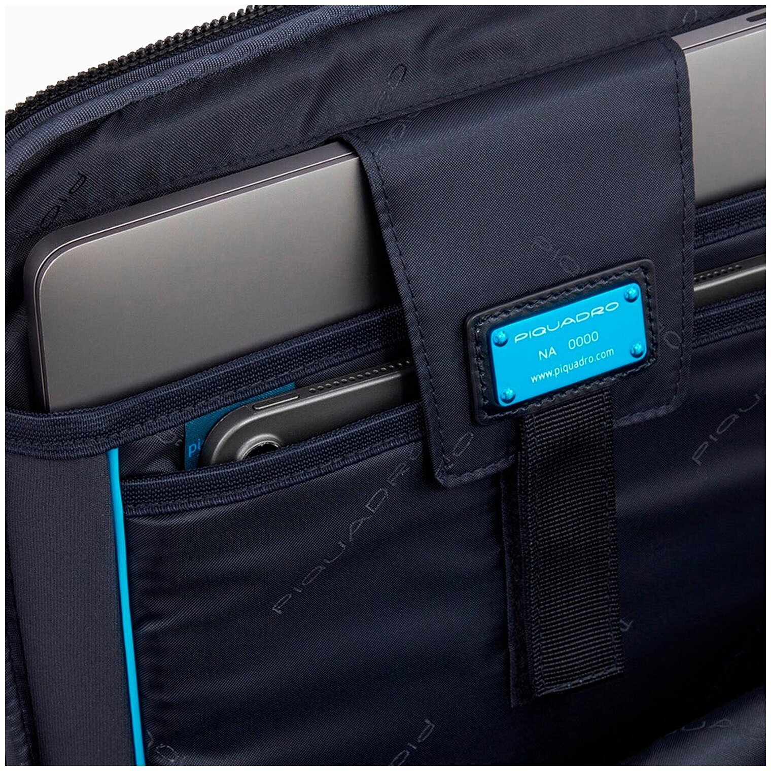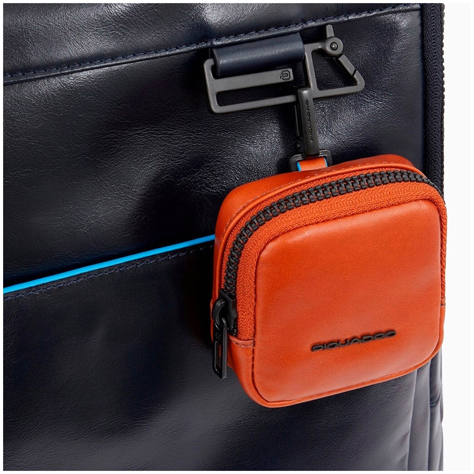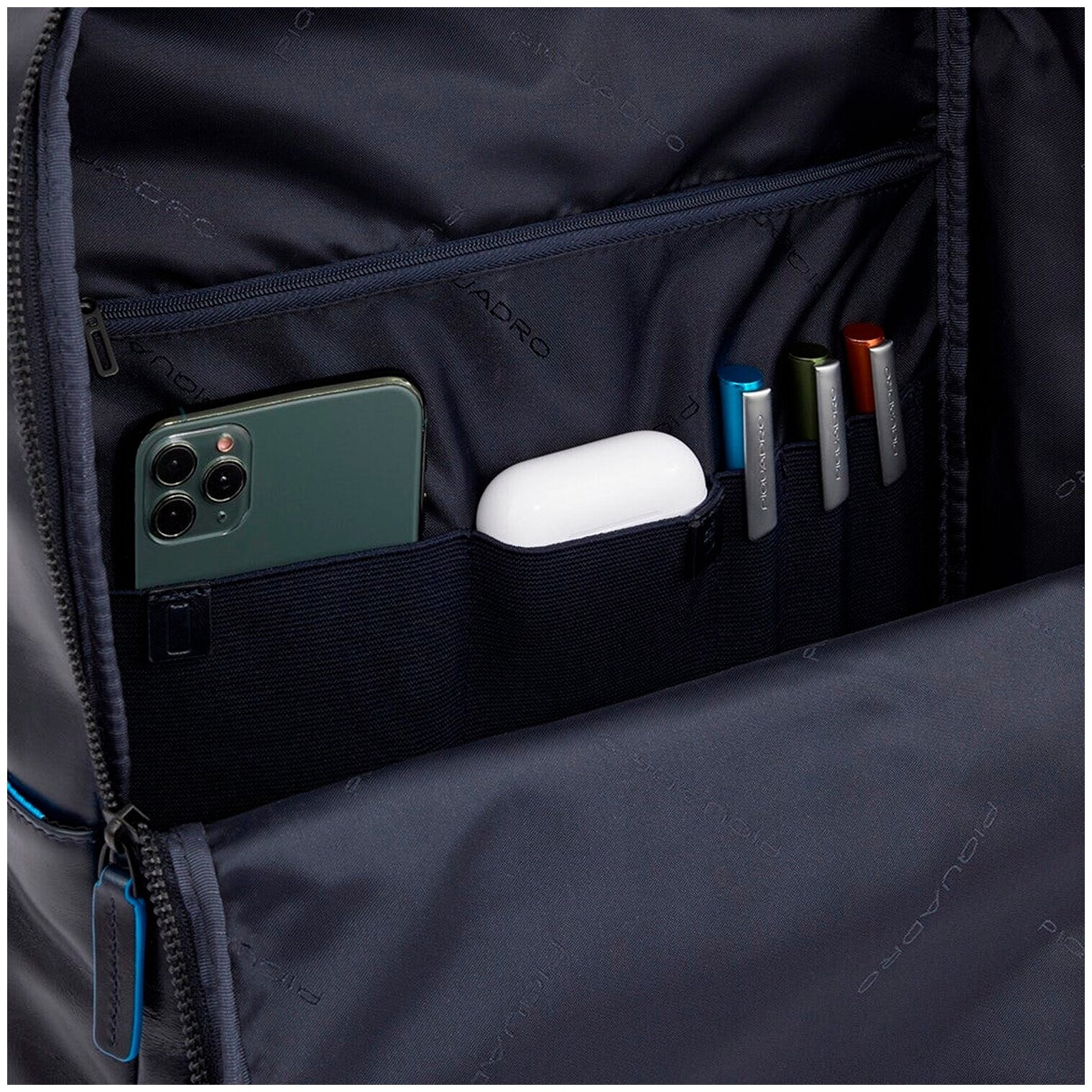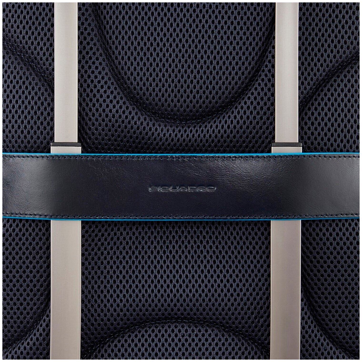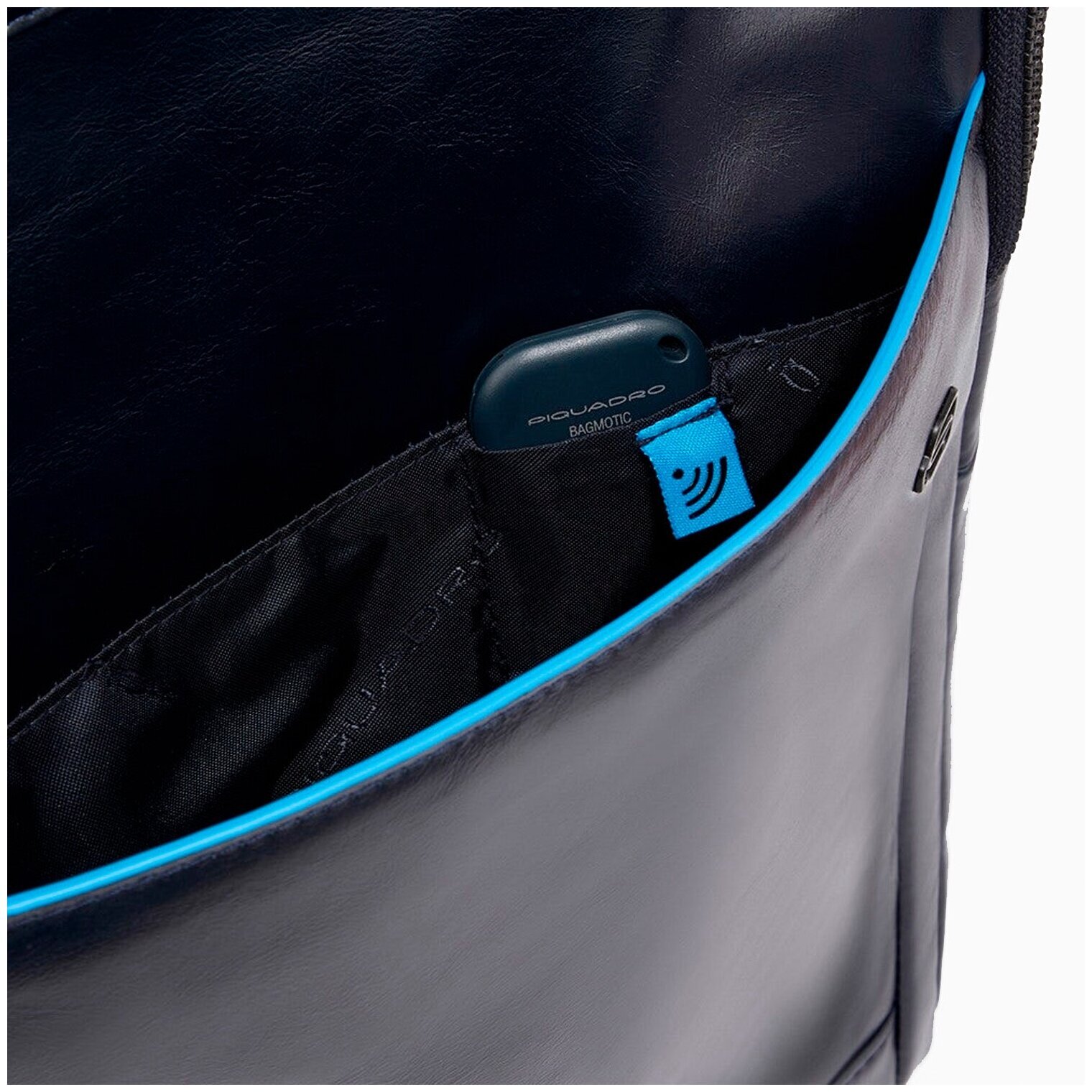 Стильный мужской рюкзак из гладкой натуральной телячьей кожи с голубым кантом и черной фурнитурой. Коллекция Blue Square Revamp (B2V). Имеет два отделения с отсеком для 15,6" ноутбука и планшета. Сбоку карман для бутылки/зонта, на задней стенке скрытый карман на молнии и крепление на дорожный чемодан. Универсальная модель рюкзака для ноутбука и документов, не громоздкая, отлично подходит для ежедневного использования. Новинка 2023 модельного года.