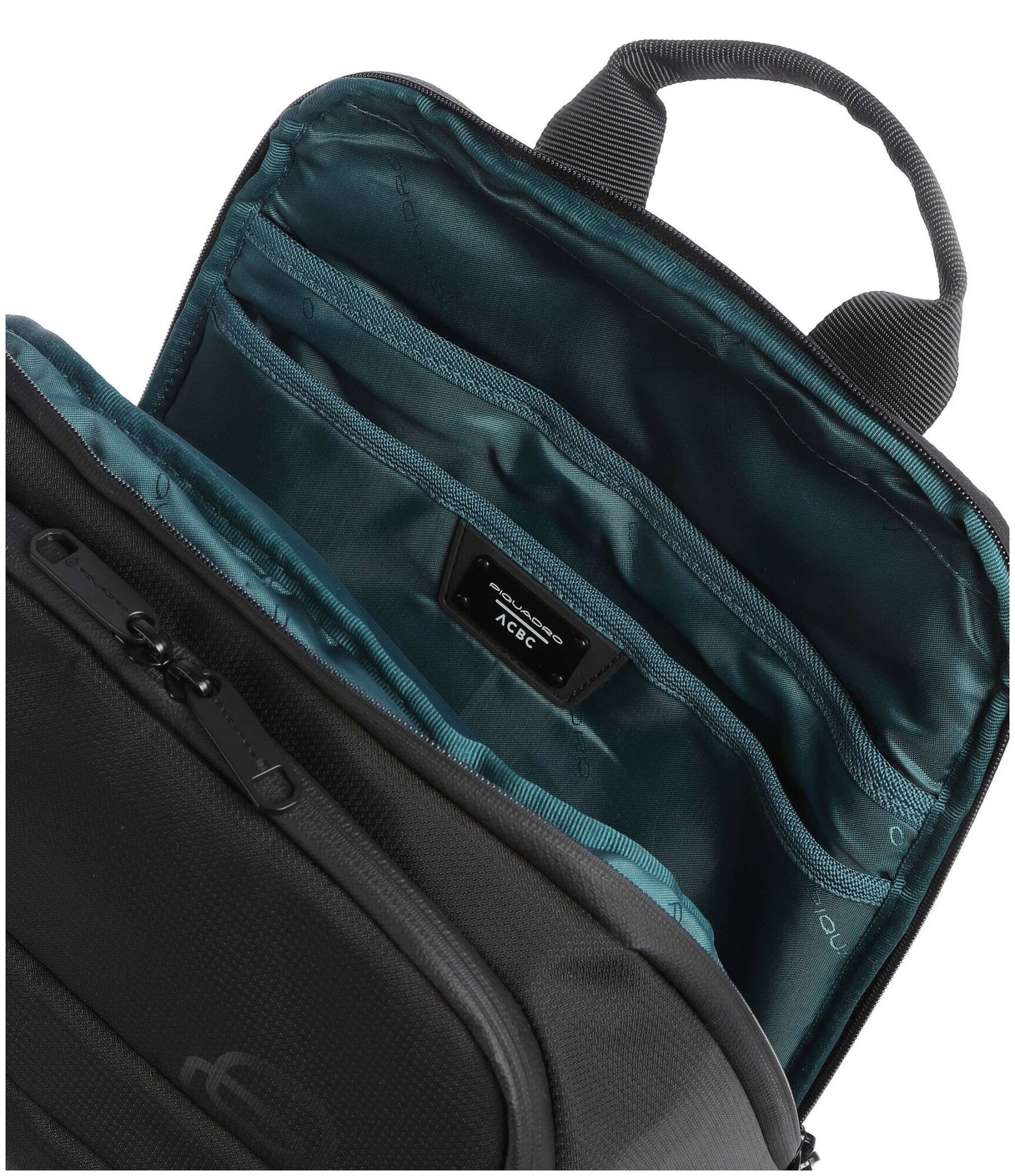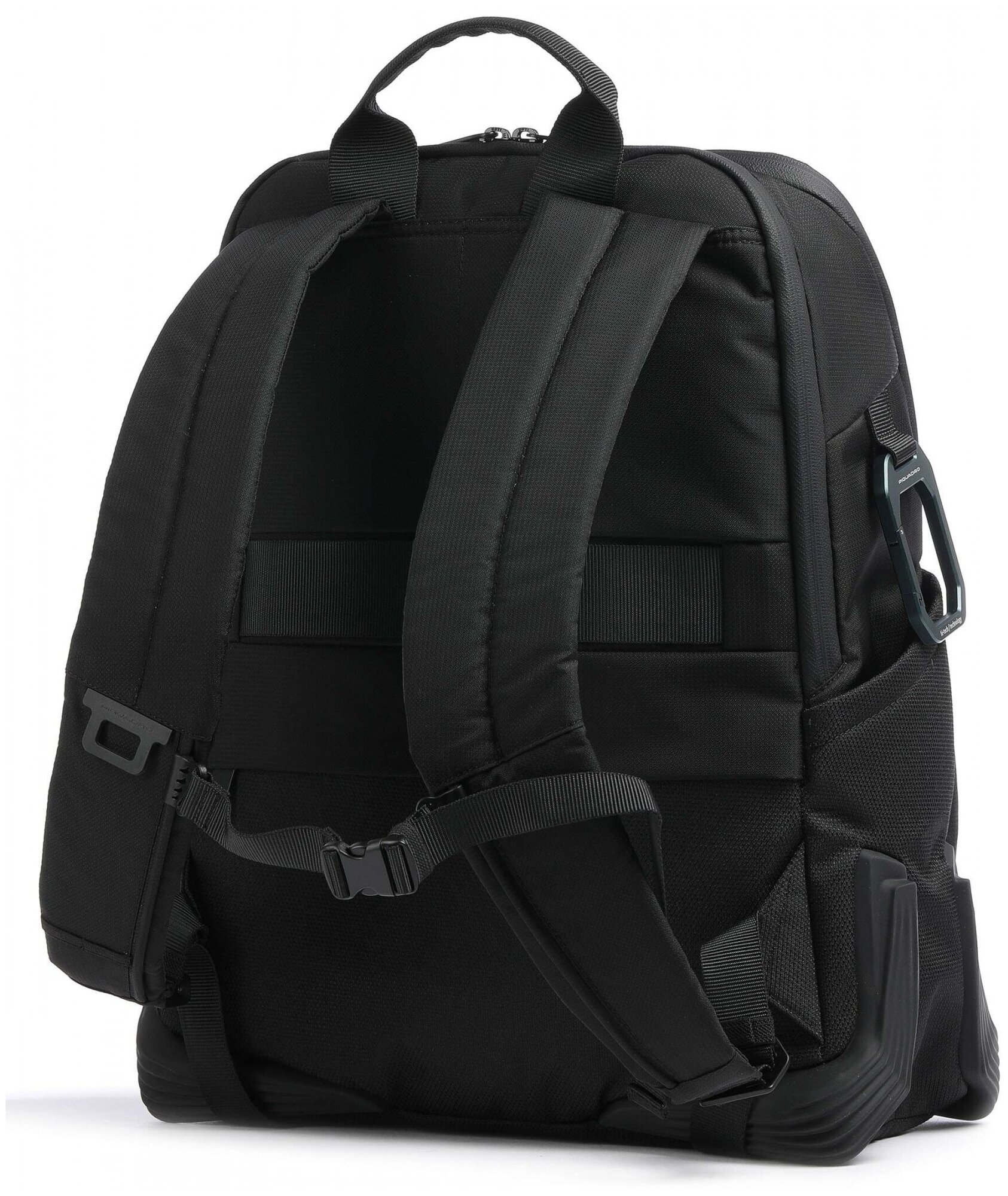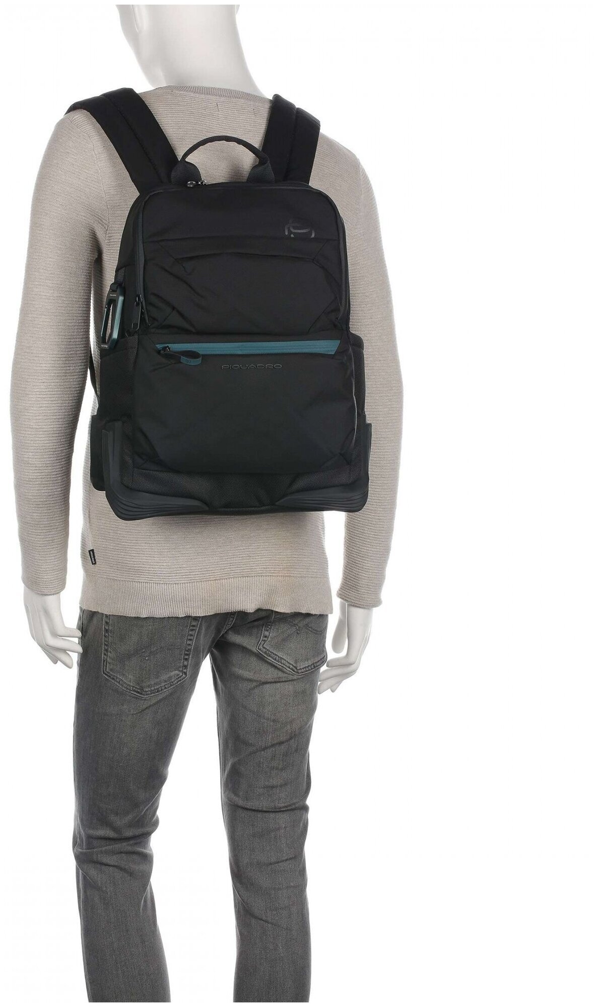Рюкзак Piquadro изготовлен из переработанной ткани, с фиксированной верхней ручкой, двумя мягкими и регулируемыми плечевыми ремнями, центральным замком на молнии, внутренним отделением с мягкой подкладкой для ноутбука 14 дюймов и планшета 11 дюймов, два внешних отделения, передние карманы на молнии, два открытых боковых кармана, два задних кармана на молнии и система крепления Trolley с лентой, размеры 35 x 42 x 19 см, объем 23 литра.