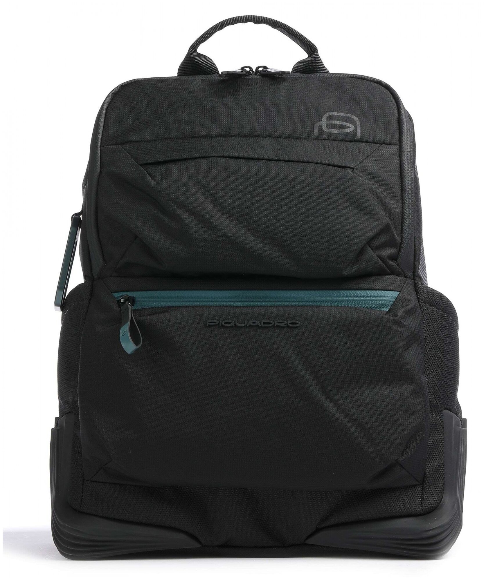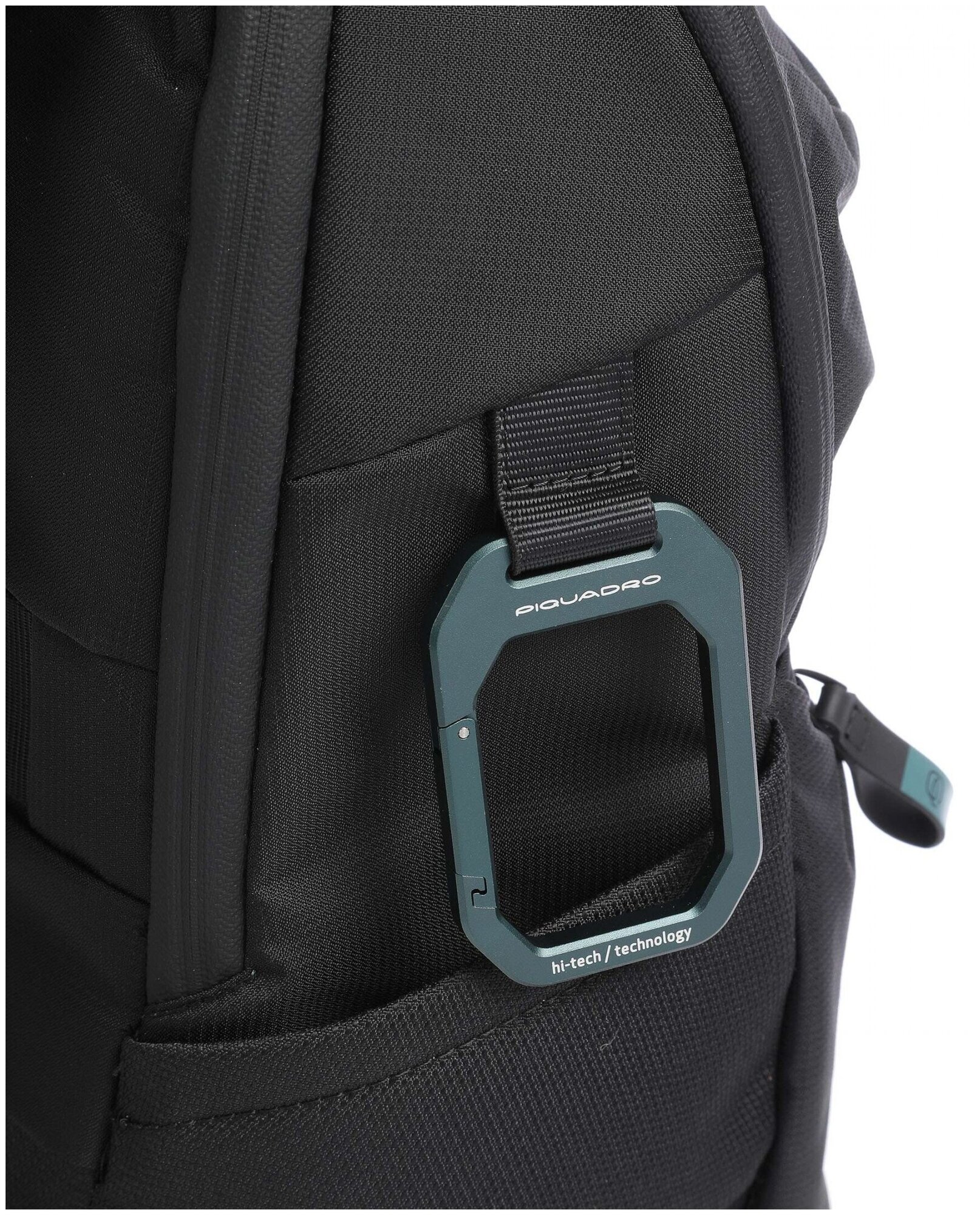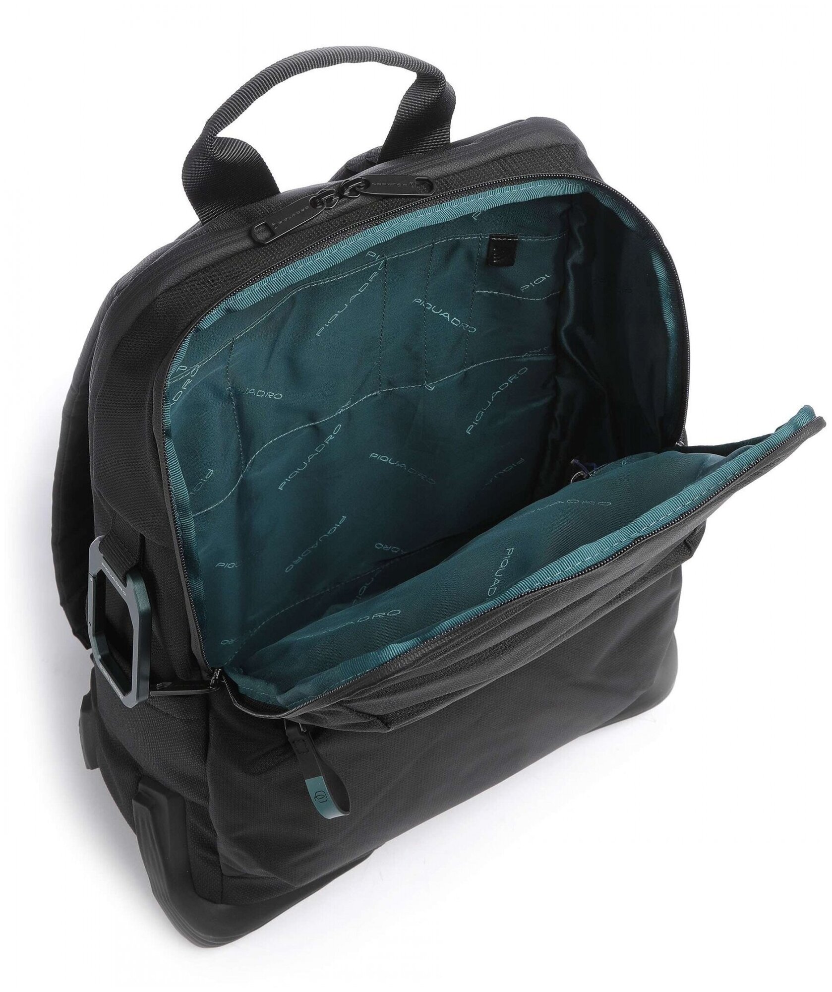Рюкзак Piquadro изготовлен из переработанной ткани, с фиксированной верхней ручкой, двумя мягкими и регулируемыми плечевыми ремнями, центральным замком на молнии, внутренним отделением с мягкой подкладкой для ноутбука 14 дюймов и планшета 11 дюймов, два внешних отделения, передние карманы на молнии, два открытых боковых кармана, два задних кармана на молнии и система крепления Trolley с лентой, размеры 35 x 42 x 19 см, объем 23 литра.