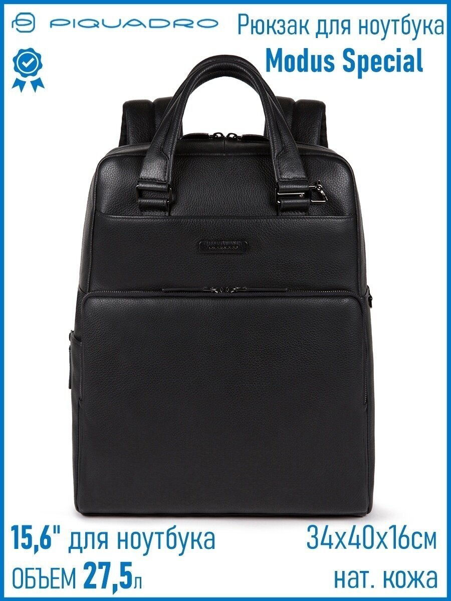 Деловой мужской бизнес-рюкзак из коллекции Piquadro Modus Special. Изготовлен из превосходной зернистой телячьей кожи с черненой металлической фурнитурой. В рюкзаке предусмотрено одно основное отделение с отсеком для 15.6 дюймового ноутбука и планшета, карманами для телефона и письменных принадлежностей. По бокам расположены карманы для бутылки и зонта, сзади предусмотрен крепеж для дорожного чемодана и карман с RFID защитой для портмоне.