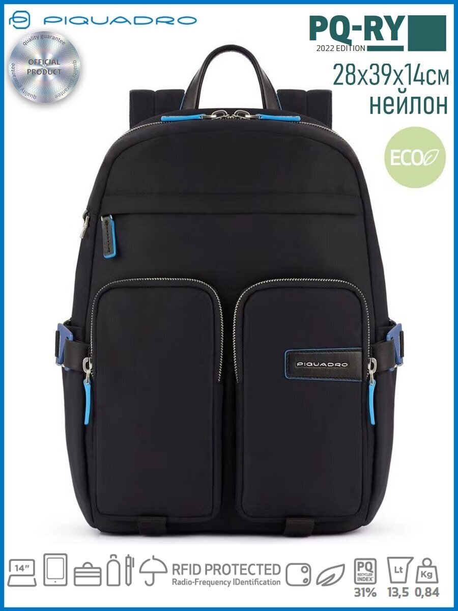 Коллекция PQ-RY изготовлена из 100% переработанного нейлона и характеризуется эффектными декоративными деталями из лицевой телячьей кожи, с узнаваемыми, характерными для бренда Piquadro окрашенными в синий цвет кромками. Повседневный городской стиль подчёркнут металлической фурнитурой и синими алюминиевыми фрональными карабинами, соответствующими по цвету кромкам кожаных вставок.
