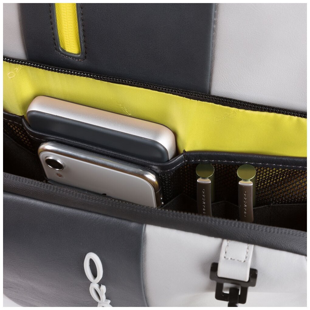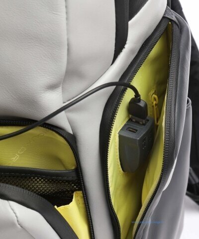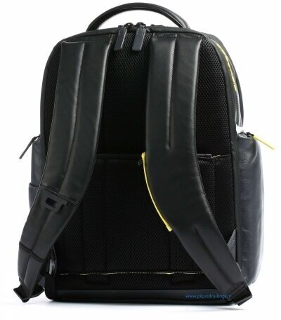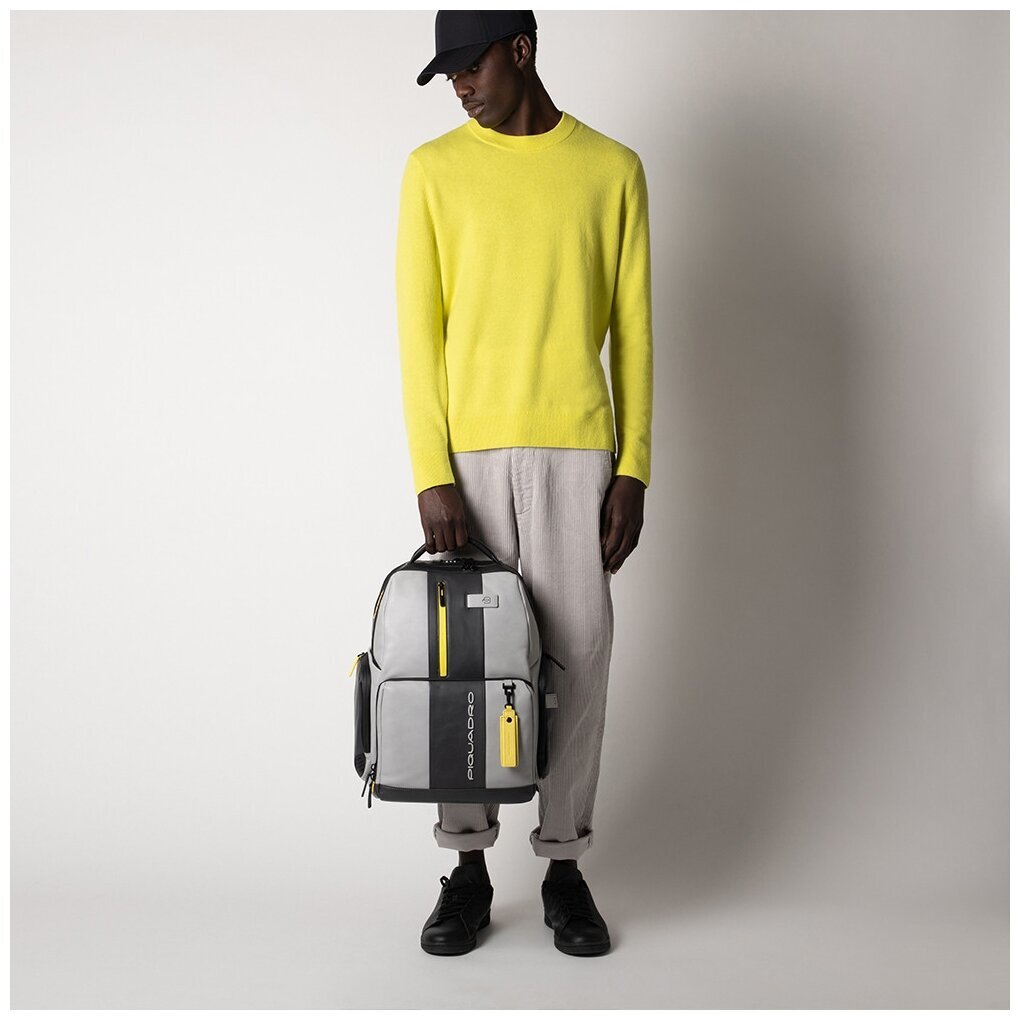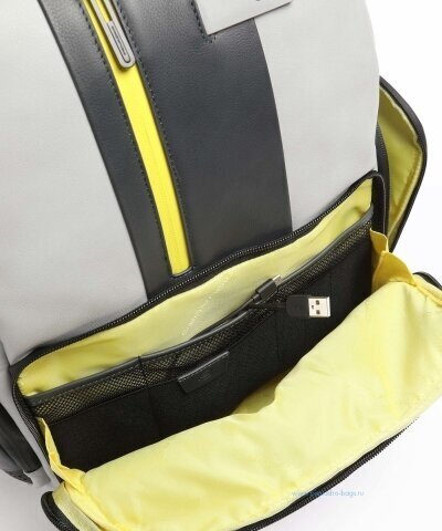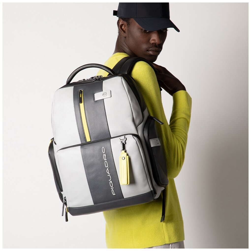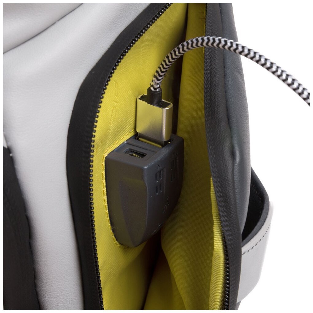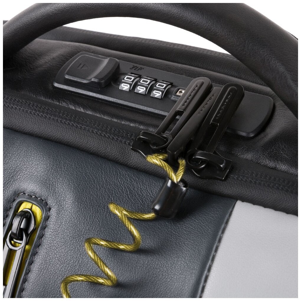 Кожаный бизнес-рюкзак из новой коллекции Piquadro Urban. Рюкзак изготовлен из мягкой телячьей кожи с использованием черненой металлической фурнитуры. Это флагманская модель рюкзака, здесь реализованы такие "фишки", как: кодовый замок на одном из отделений, датчик CONNEQU для отслеживания местоположения рюкзака, RFID защита, позволяющая избежать снятия денежных средств бесконтактным способом, "антиворовской" шнур, с помощью которого можно пристегнуть рюкзак и не беспокоится, что его своруют, USB выходы для зарядки Ваших гаджетов, а также крепеж на чемодан, крючок для очков и брелок с контактной информацией. Рюкзак имеет два отделения в одном из которых расположен отсек для 15,6 дюймового ноутбука и планшета, а боковые карманы предназначены для небольшой бутылки и зонтика. Идеальный вариант, как для работы на каждый день, так и для поездок.