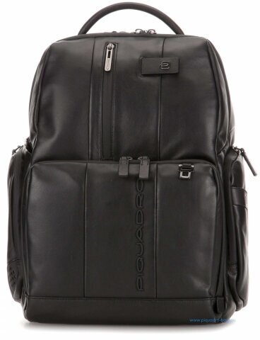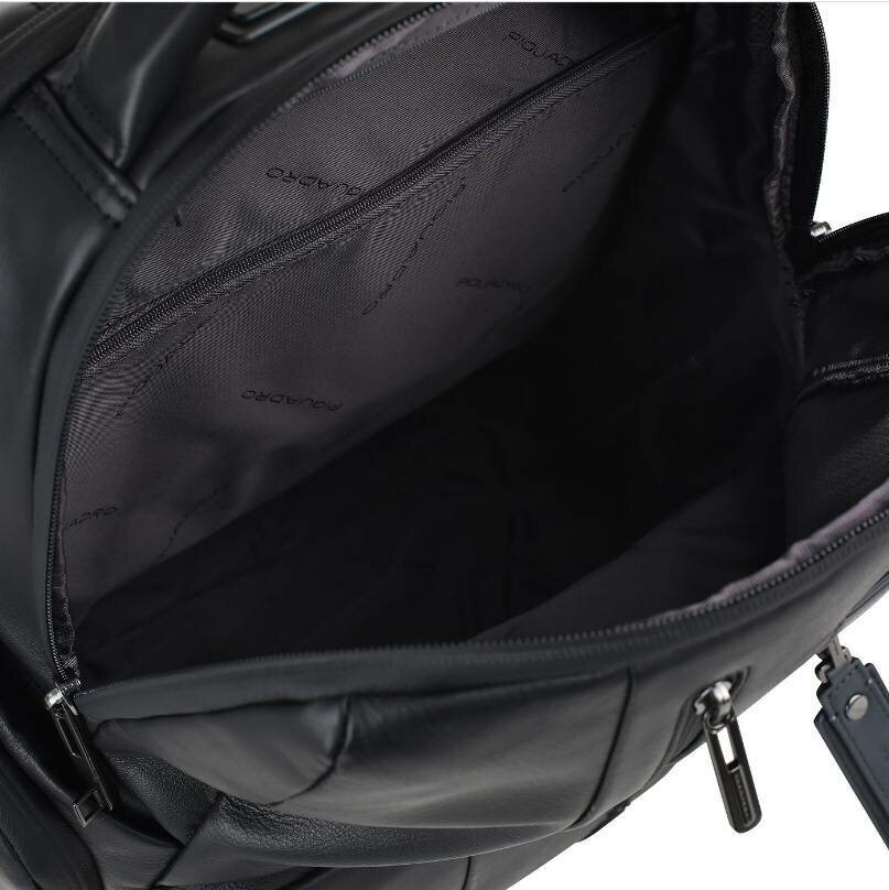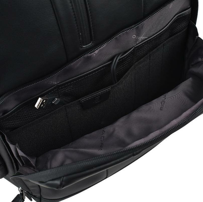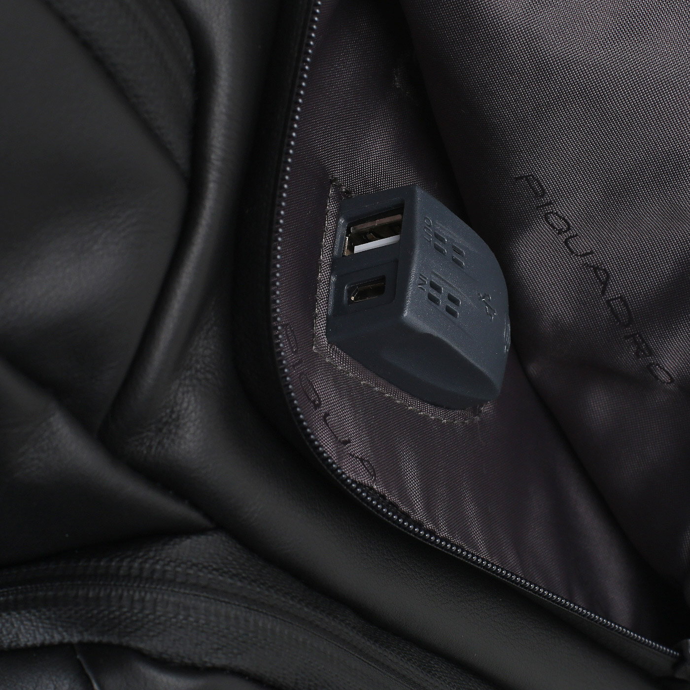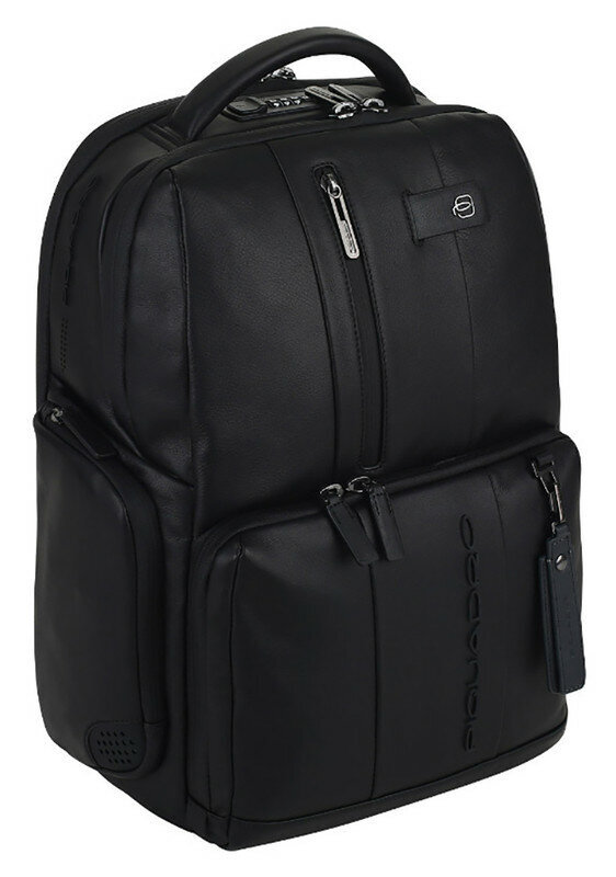 Кожаный бизнес-рюкзак из новой коллекции Piquadro Urban. Рюкзак изготовлен из мягкой телячьей кожи с использованием черненой металлической фурнитуры. Это флагманская модель рюкзака, здесь реализованы такие "фишки", как: кодовый замок на одном из отделений, датчик CONNEQU для отслеживания местоположения рюкзака, RFID защита, позволяющая избежать снятия денежных средств бесконтактным способом, "антиворовской" шнур, с помощью которого можно пристегнуть рюкзак и не беспокоится, что его своруют, USB выходы для зарядки Ваших гаджетов, а также крепеж на чемодан, крючок для очков и брелок с контактной информацией. Рюкзак имеет два отделения в одном из которых расположен отсек для 15,6 дюймового ноутбука и планшета, а боковые карманы предназначены для небольшой бутылки и зонтика. Идеальный вариант, как для работы на каждый день, так и для поездок.