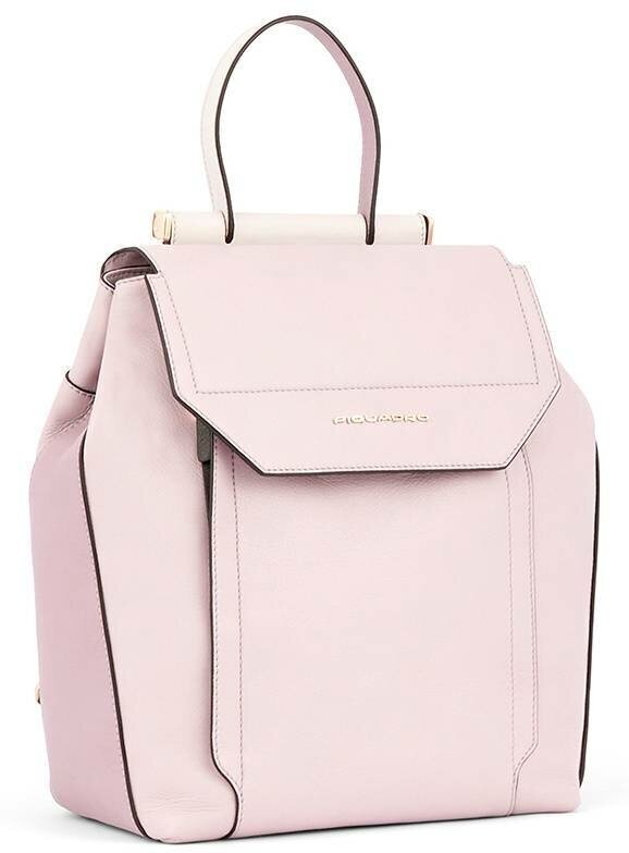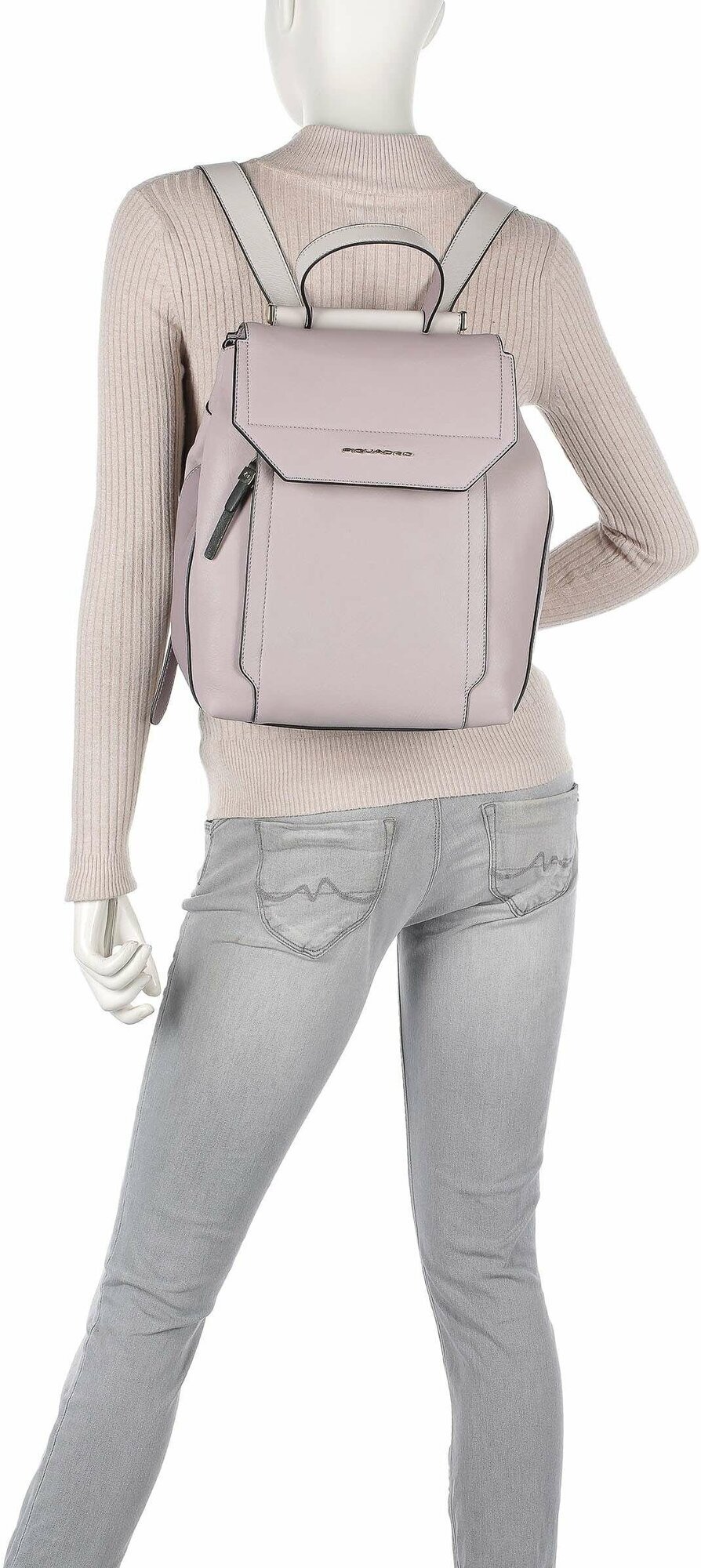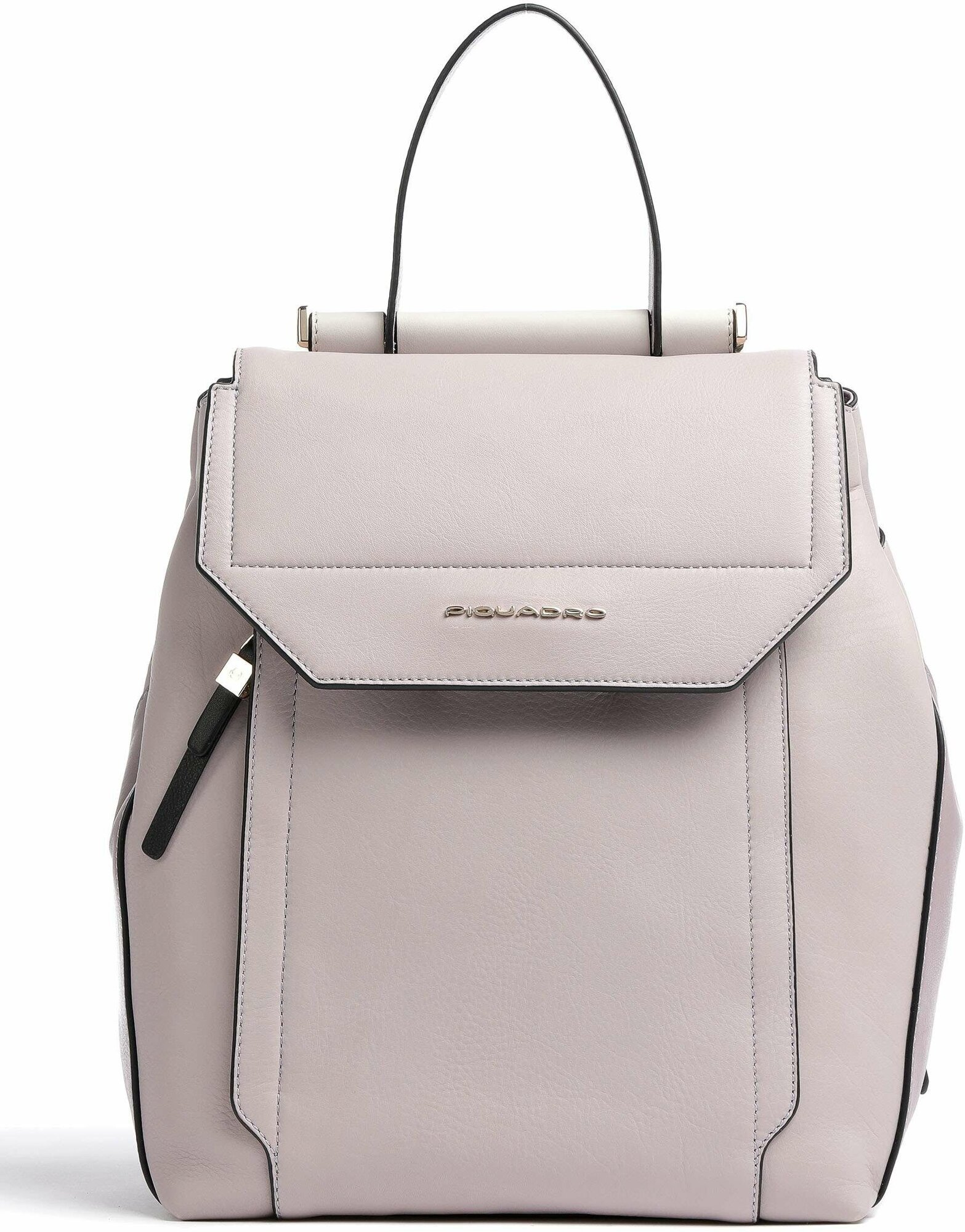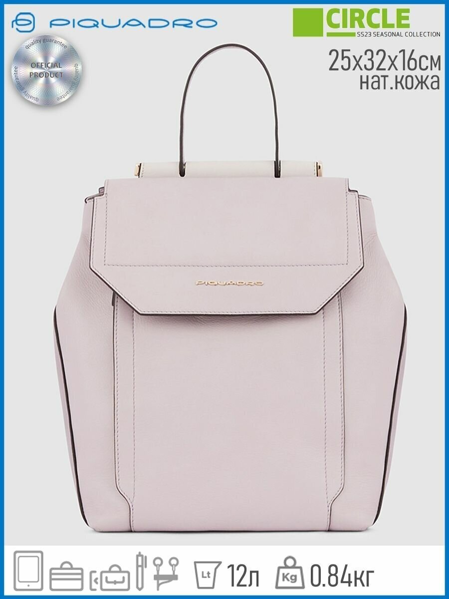 Компактный кожаный женский рюкзак из коллекции Piquadro Circle. Изготовлен из высококачественной зернистой телячьей кожи с использованием надежной и стильной металлической фурнитуры золотистого цвета. Рюкзак имеет одно отделение с отсеком для планшета, кармашки для телефона и письменных принадлежностей. На задней части рюкзака расположена планка для крепления на ручку чемодана